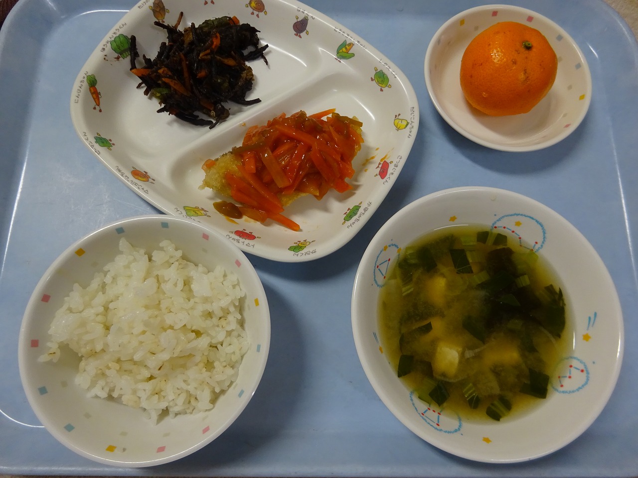 12月1日(火)給食 ・ごはん ・さわらの甘酢あん(さわら・玉ねぎ・にんじん・ピーマン・ケチャップ) ・ひじきの炒め煮(ひじき・油揚げ・にんじん・いんげん) ・みそ汁(豆腐・だいこん・こまつな・しいたけ・ねぎ・みそ) ・みかん