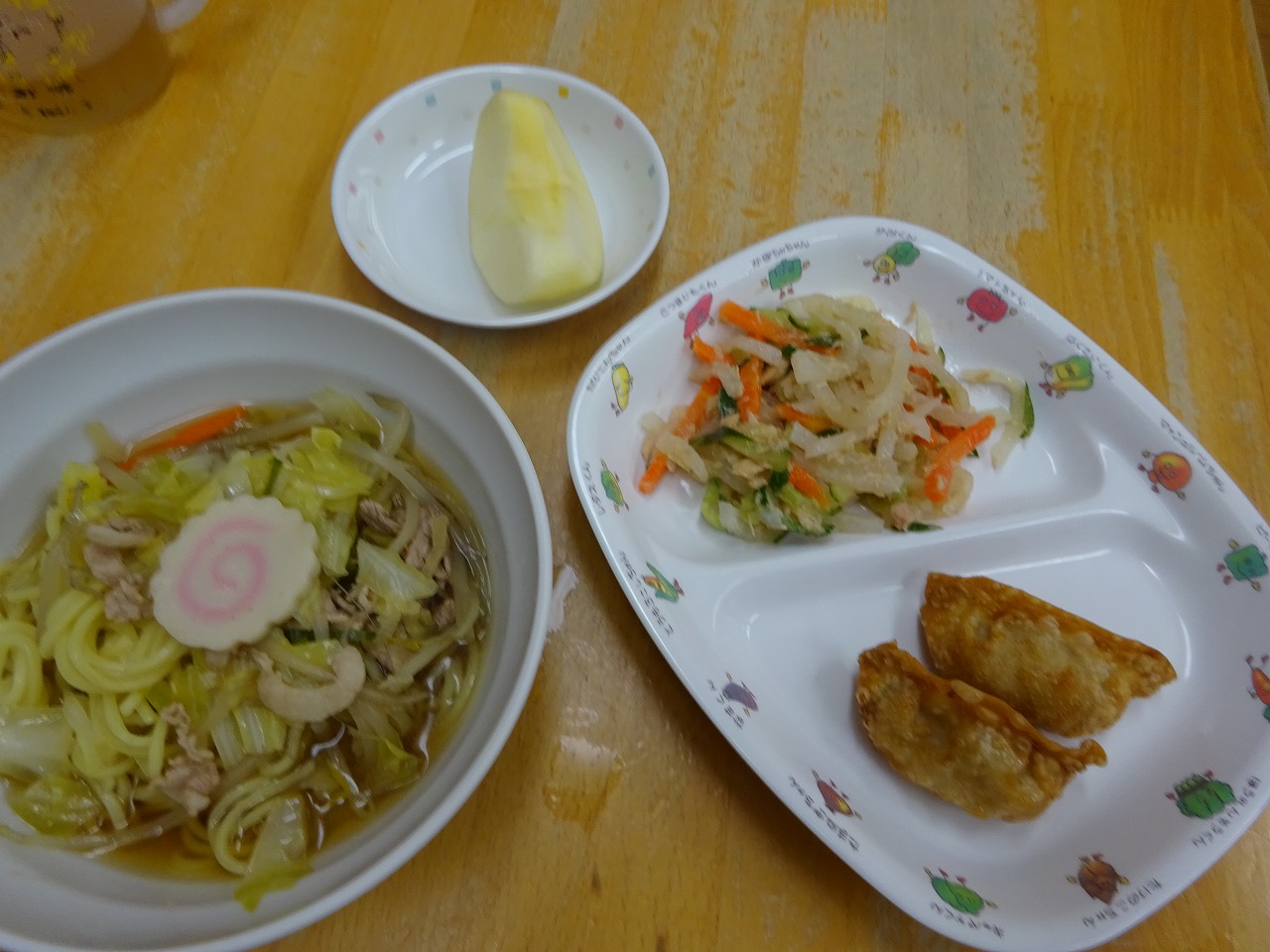 11月4日(水)給食 ・しょうゆラーメン(麺・豚肉・なると・もやし・キャベツ・にんじん・ねぎ) ・大根サラダ(だいこん・きゅうり・にんじん・ツナ) ・揚げぎょうざ ・りんご