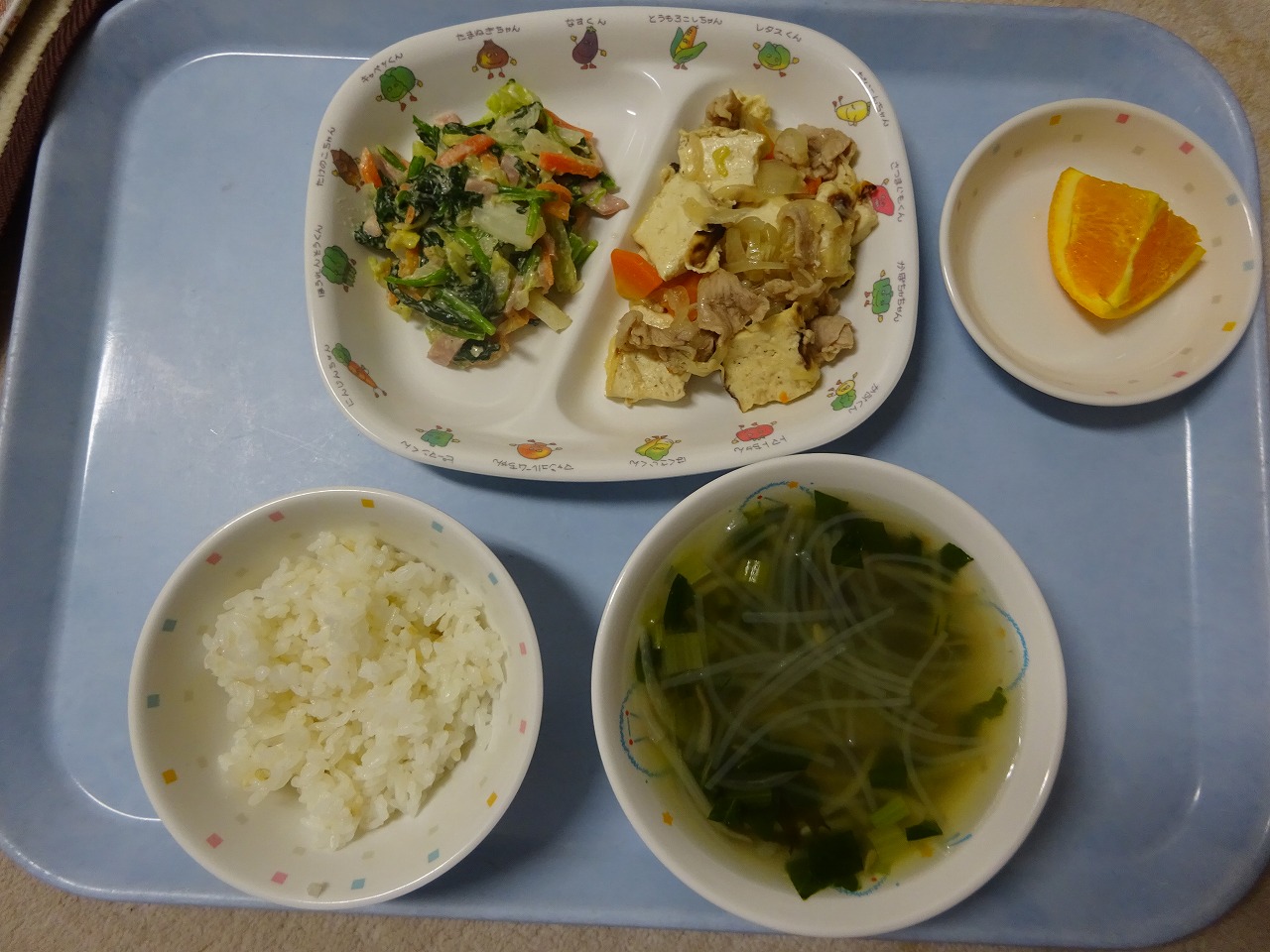 11月11日(水)給食 ・ごはん ・肉豆腐(豚肉・焼き豆腐・玉ねぎ・にんじん・えのきたけ・ねぎ) ・ほうれん草サラダ(ほうれん草・キャベツ・ハム・にんじん・マヨ) ・中華スープ(玉ねぎ・もやし・こまつな・マロニー) ・オレンジ ・