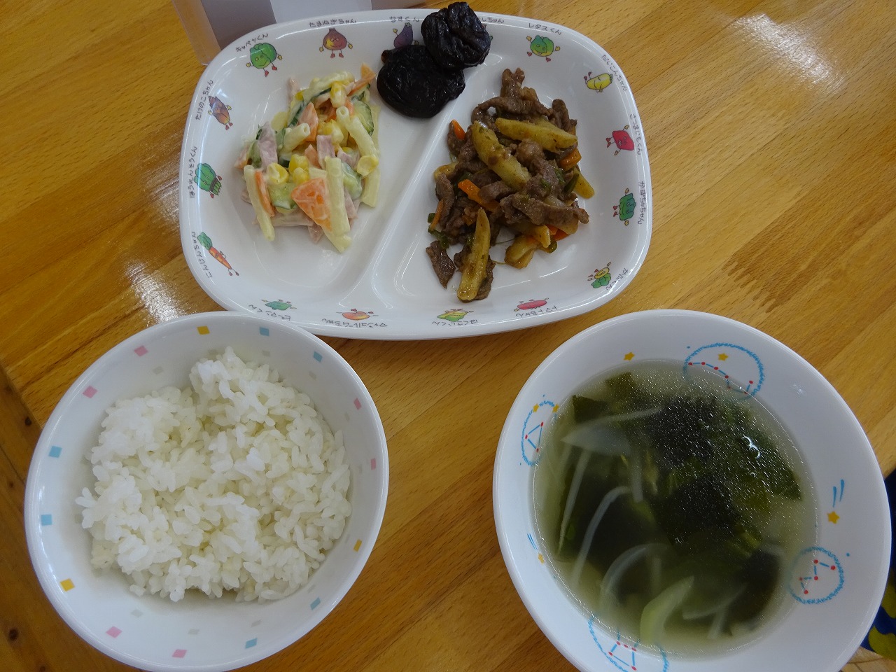 11月16日(月)給食 ・ごはん ・チンジャオロース(牛肉・ピーマン・にんじん・たけのこ・フライドポテト) ・マカロニサラダ(マカロニ・きゅうり・にんじん・ハム・コーン・マヨドレ) ・わかめスープ(わかめ・ちんげん菜・もやし・玉ねぎ) ・プルーン