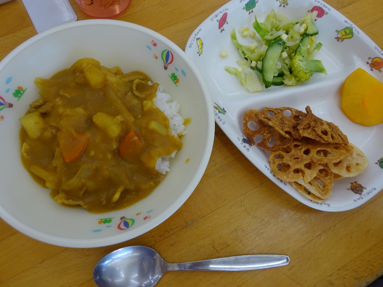 11月17日(火)給食 ・カレーライス(米・豚肉・じゃがいも・玉ねぎ・にんじん・ピーマン) ・チーズサラダ(チーズ・キャベツ・きゅうり・にんじん・ブロッコリー) ・れんこんチップス ・かき
