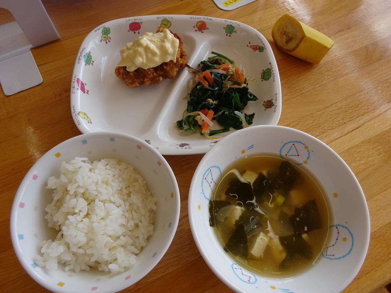 11月18日(水) 給食 ・ごはん ・チキン南蛮(鶏肉・卵・玉ねぎ・マヨドレ) ・五目あえ(ほうれん草・もやし・にんじん・油揚げ・しらたき・) ・みそ汁(豆腐・なめこ・玉ねぎ・みそ) ・バナナ