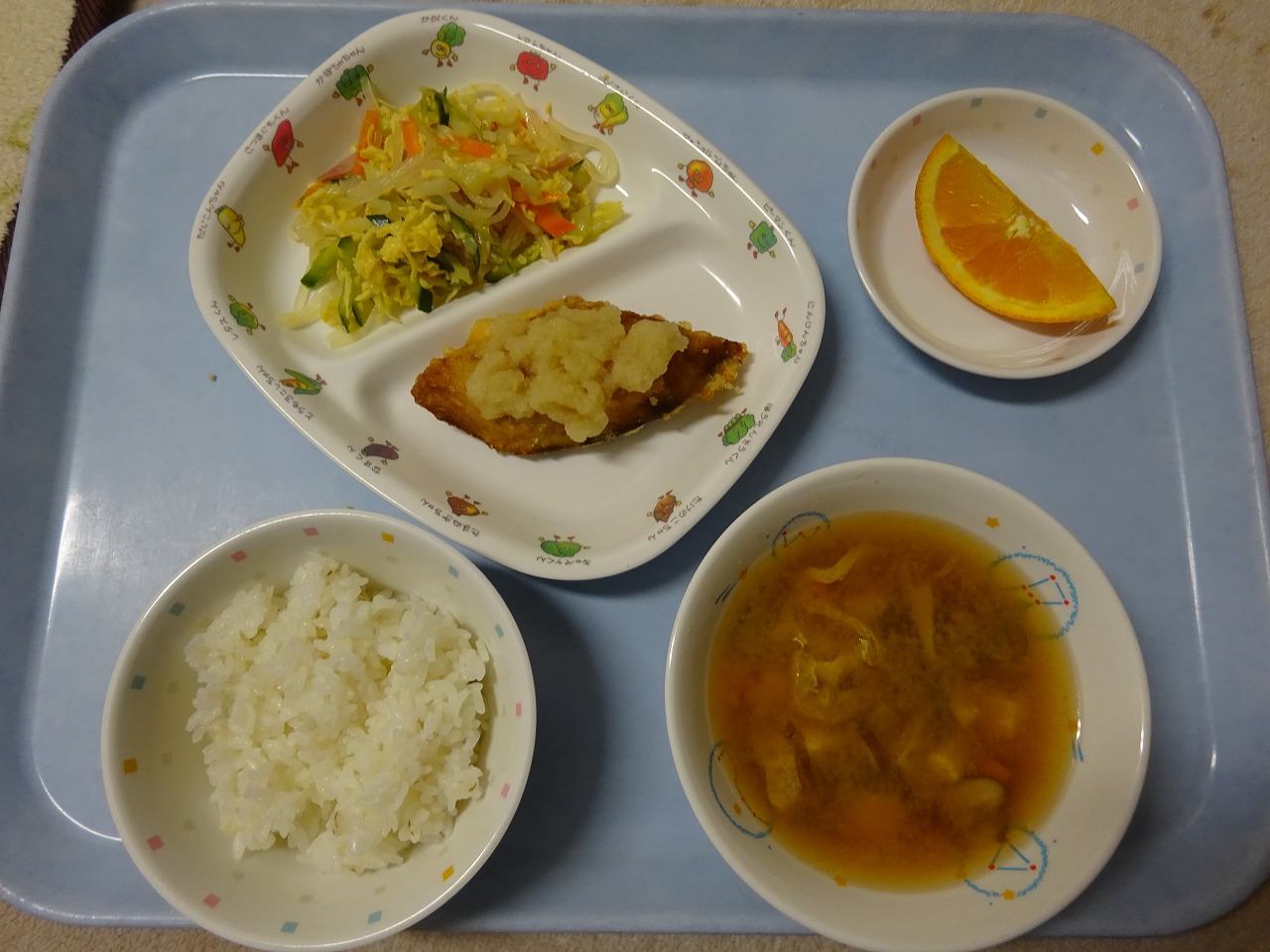 9月3日(木)給食 ・ごはん ・揚げ魚のおろしソースかけ(さわら・だいこん) ・バンサンスー(キャベツ・きゅうり・にんじん・ハム・マロニー・たまご) ・みそ汁(豆腐・油揚げ・しいたけ・にんじん・ねぎ) ・オレンジ