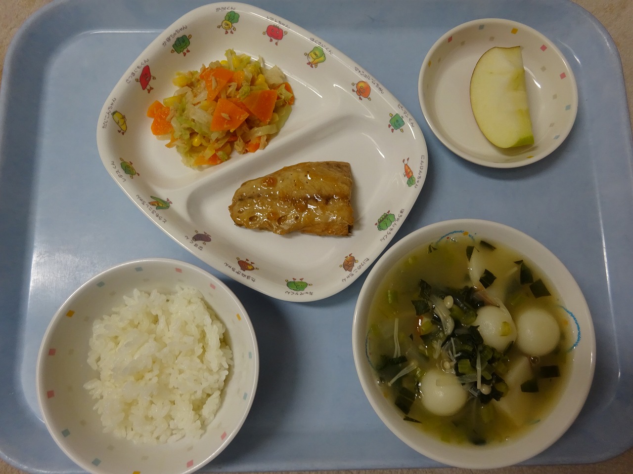 9月9日(水)給食 ・ごはん ・さばのみぞれ煮 ・ブロッコリーごまあえ(キャベツ・にんじん・ブロッコリー・ごま) ・だんご汁(だんご・かまぼこ・えのきたけ・玉ねぎ・こまつな) ・りんご