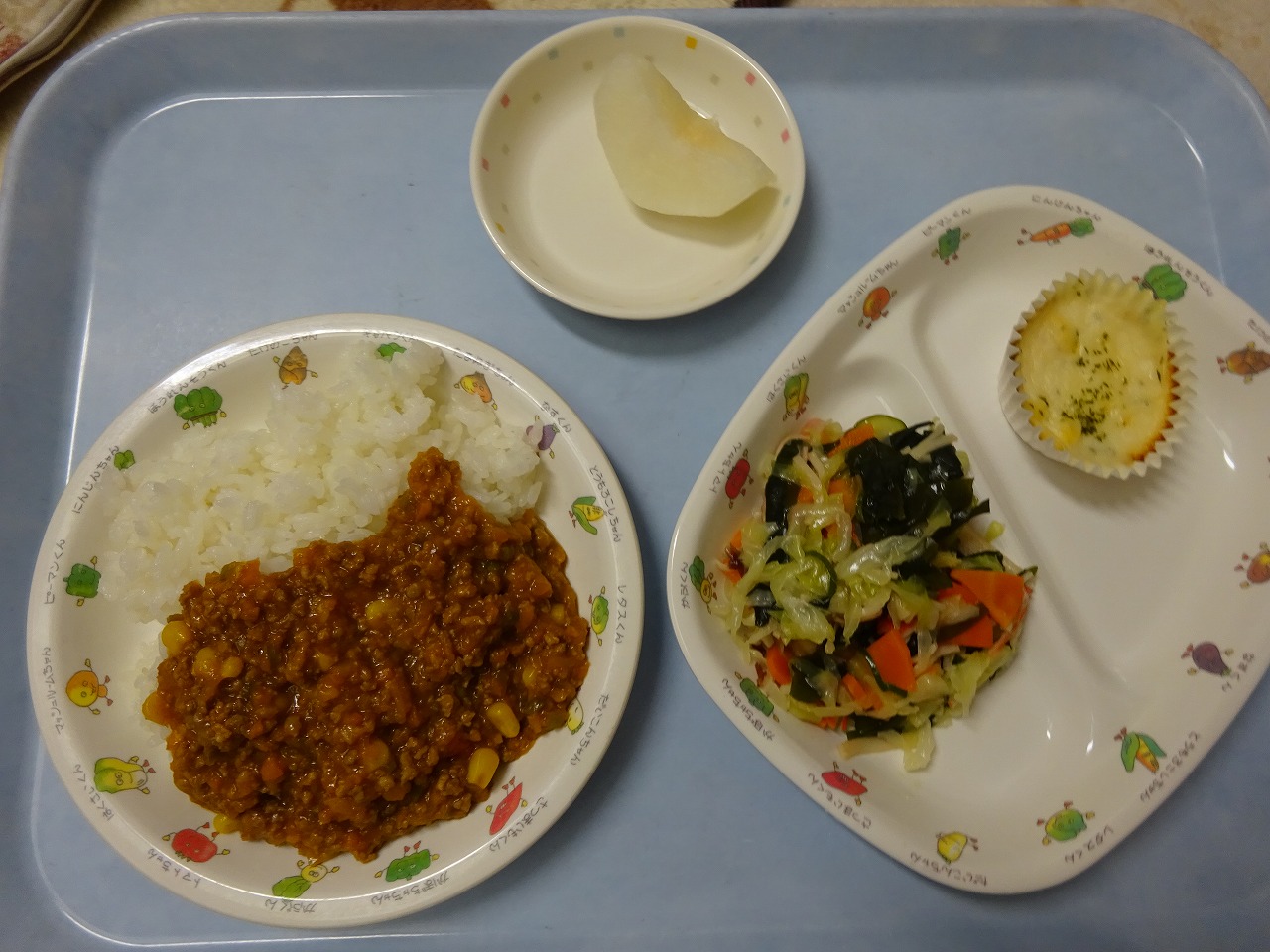 9月14日(月)給食 ・キーマカレー(米・合挽肉・玉ねぎ・にんじん・コーン・ピーマン) ・海草サラダ(キャベツ・きゅうり・にんじん・海藻・かにかま) ・コーングラタン ・なし