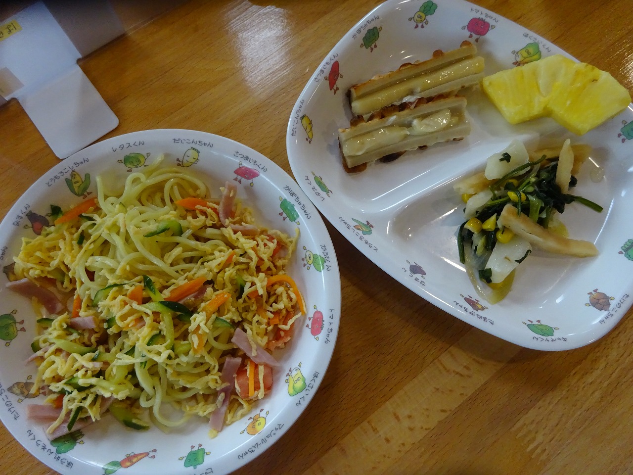 9月17日(木)給食 ・冷やし中華(麺・ハム・卵・トマト・きゅうり・にんじん) ・ポパイソテー(ほうれん草・キャベツ・コーン・ポテト) ・ちくわのマヨ焼き ・パイナップル