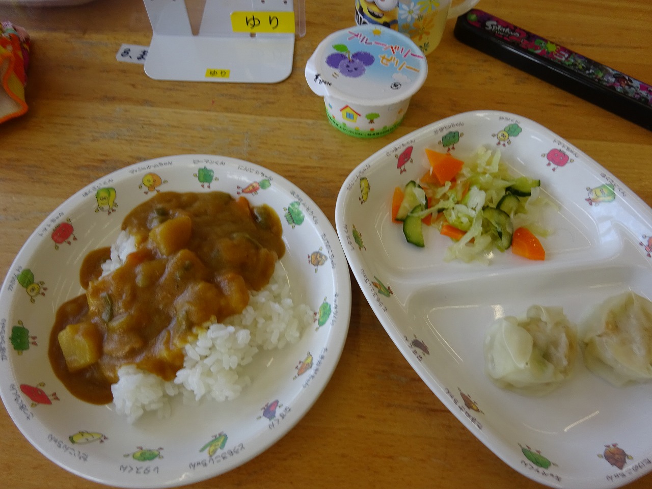8月18日(火)給食 ・シーフードカレーライス(米・えび・いか・じゃがいも・玉ねぎ・ピーマン・にんじん) ・フレンチサラダ(キャベツ・きゅうり・にんじん) ・枝豆シューマイ ・オレンジ