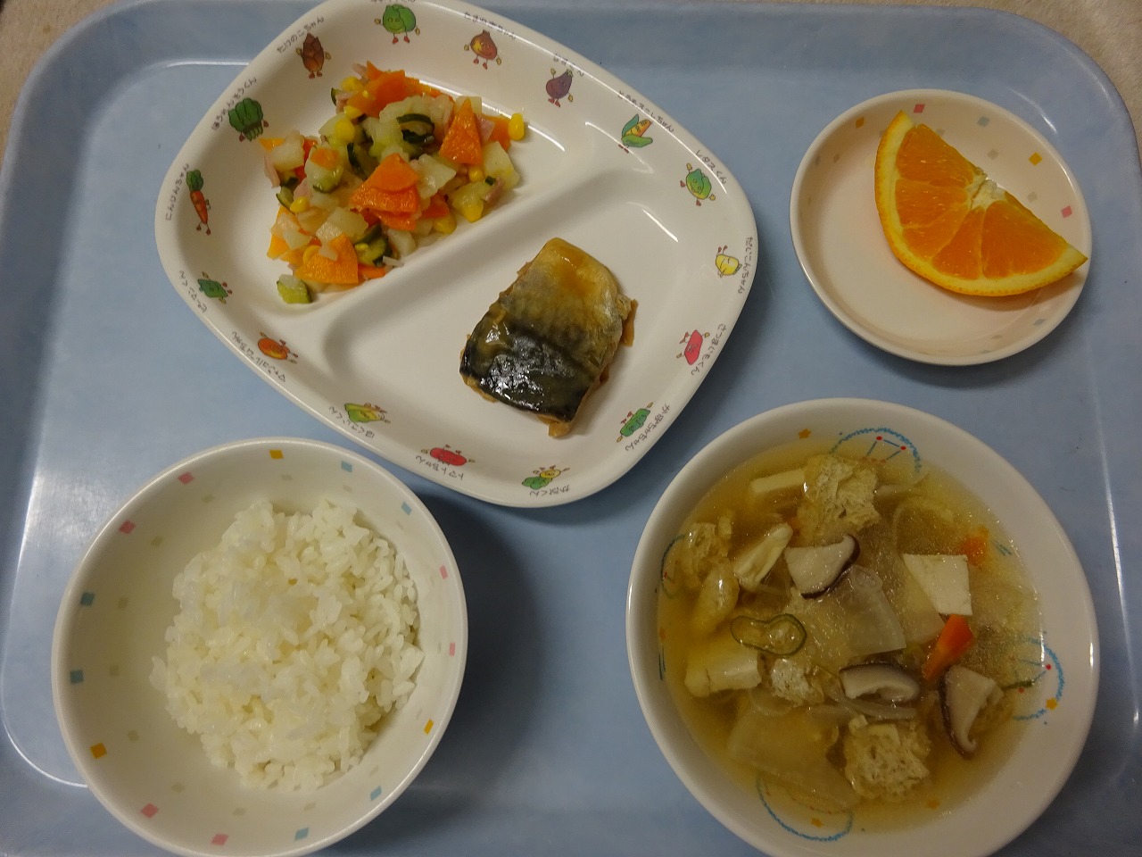 8月19日(水)給食 , おやつ ・ごはん ・さばのみそ煮 ・ポテトサラダ(じゃがいも・きゅうり・にんじん・玉ねぎ・ハム・コーン) ・ごもく汁(豆腐・油揚げ・しいたけ・だいこん・にんじん・ねぎ) ・プルーン おやつは、『カルピスポンチ』 みかん、もも、パインと市販のゼリーを混ぜて、カルピスウォーターを入れました。