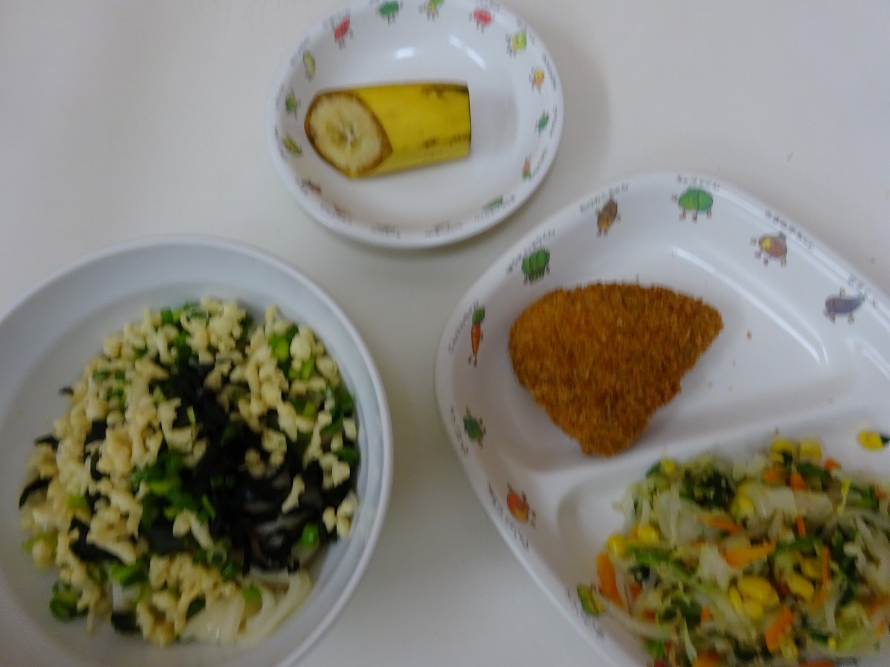 9月1日(火)給食・わかめごはん(米・わかめ) ・星のコロッケ ・ほうれん草のおひたし(ほうれん草・キャベツ・もやし・にんじん) ・すまし汁(豆腐・鶏肉・玉ねぎ・みつば) ・バナナ