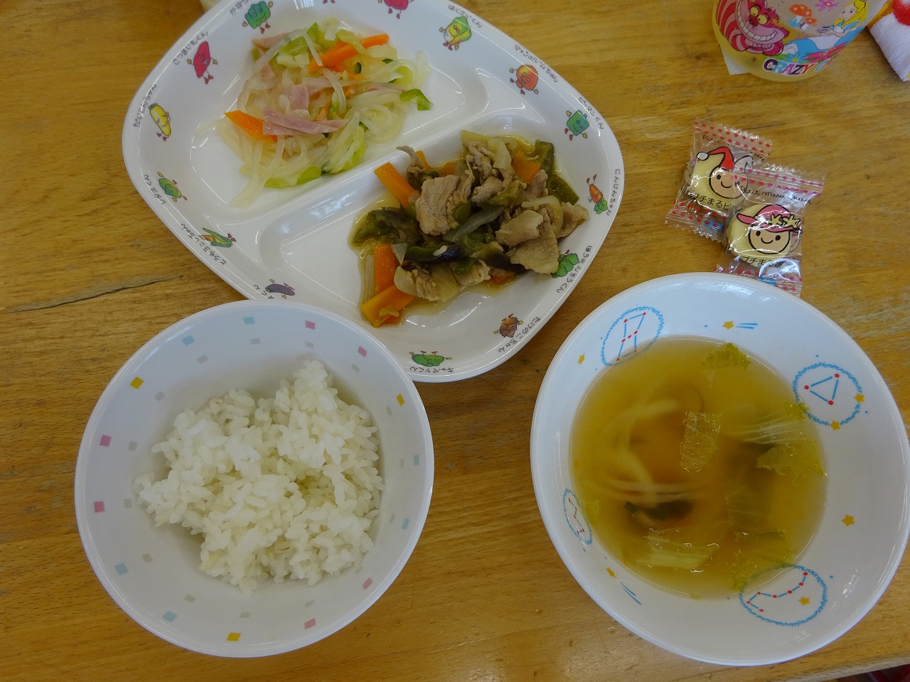 8月21日(金)給食 ・ごはん ・豚肉となすのみそ炒め(豚肉・なす・キャベツ・玉ねぎ・にんじん・ピーマン・みそ) ・マロニー中華あえ(マロニー・きゅうり・にんじん・ハム) ・レタススープ(レタス・玉ねぎ・しめじ・もやし・トマト) ・チーズ