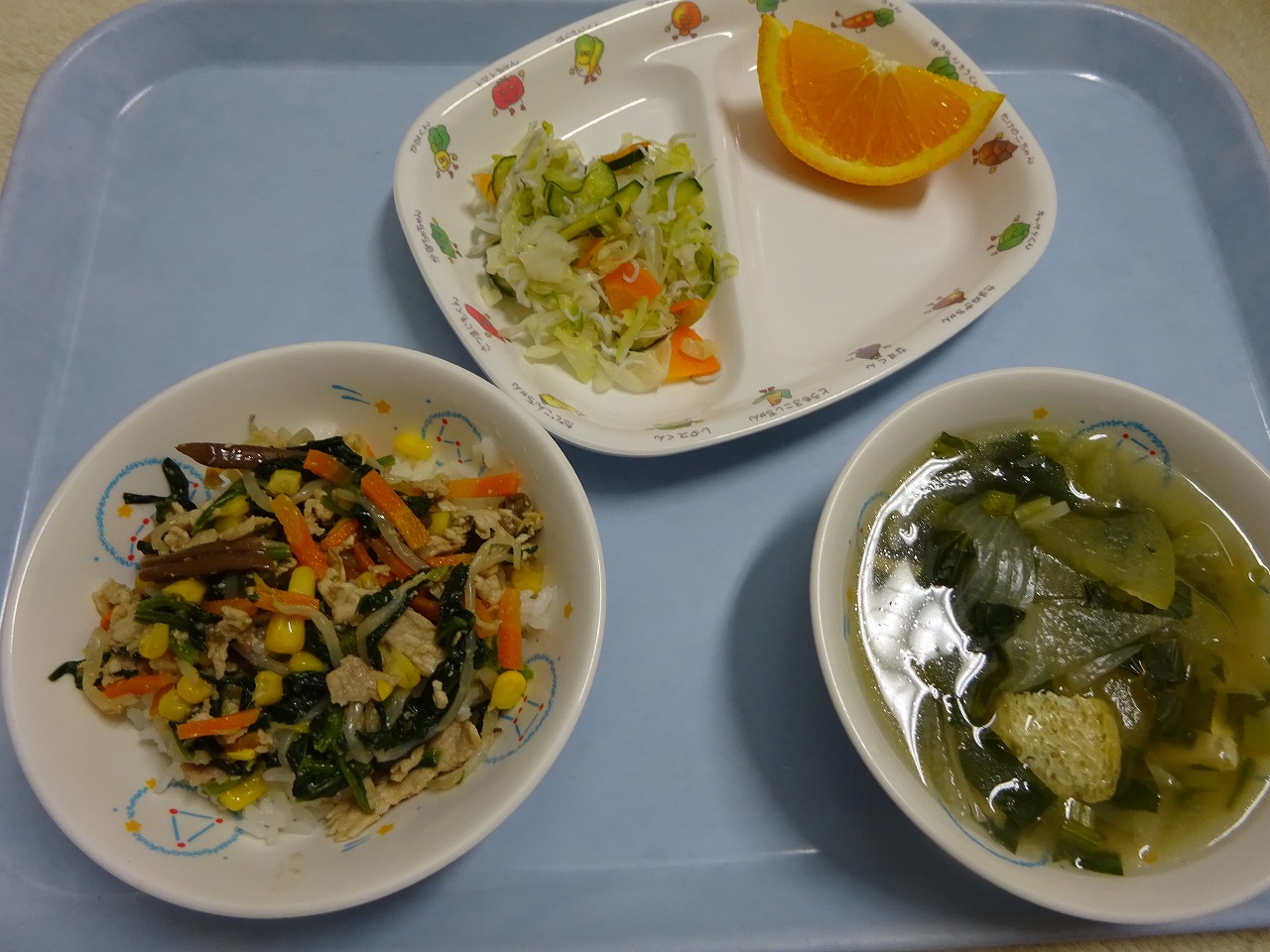 8月24日(月)給食 ・ビビンバ(米・豚肉・ほうれん草・もやし・にんじん・ぜんまい・コーン) ・キャベツの甘酢あえ(キャベツ・きゅうり・にんじん・しらす干し) ・とうがんスープ(とうがん・豆腐・油揚げ・こまつな・玉ねぎ) ・オレンジ