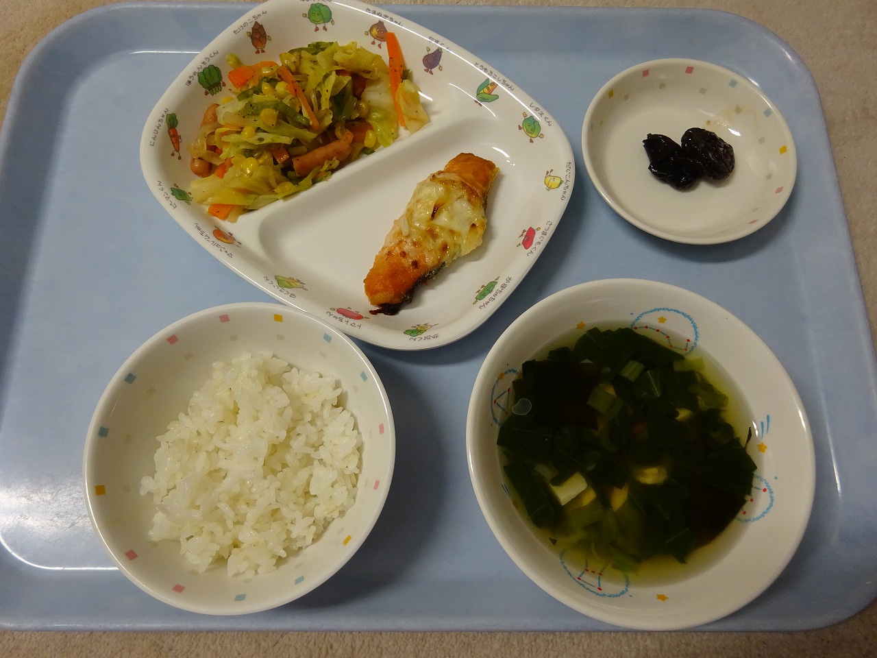 8月27日(木) 給食 ・ごはん ・鮭のマヨドレ焼き(鮭・玉ねぎ・マヨドレ) ・いろどりソテー(キャベツ・ウインナー・玉ねぎ・にんじん・ピーマン・コーン) ・すまし汁(豆腐・こまつな・にんじん・わかめ・ねぎ) ・プルーン