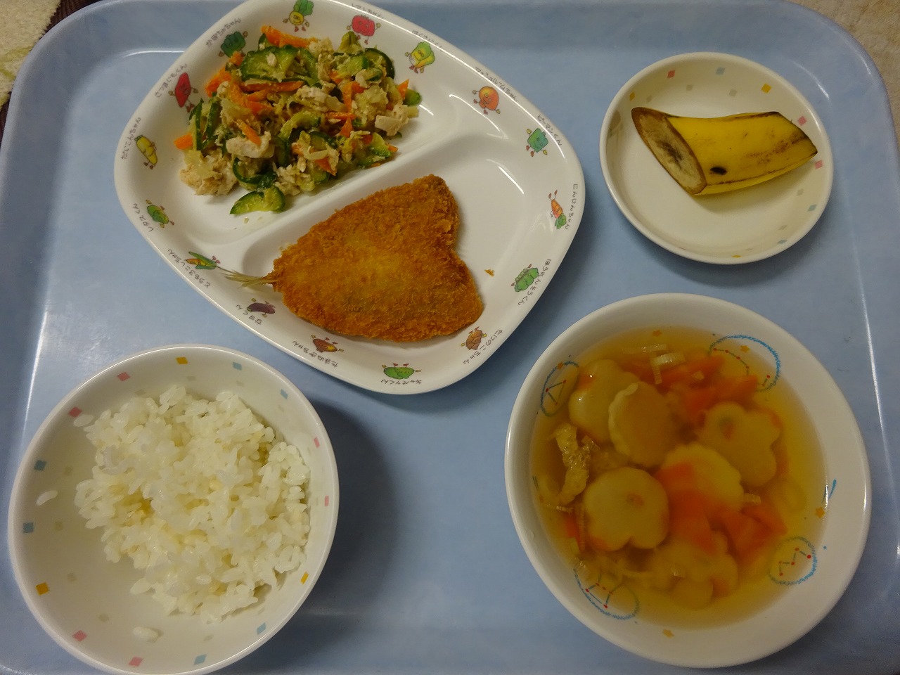 7月22日(水)給食 ・ごはん ・あじフライ ・バンバンジー(鶏肉・キャベツ・きゅうり・にんじん) ・すまし汁(なると・油揚げ・花ふ・にんじん・ねぎ) ・バナナ