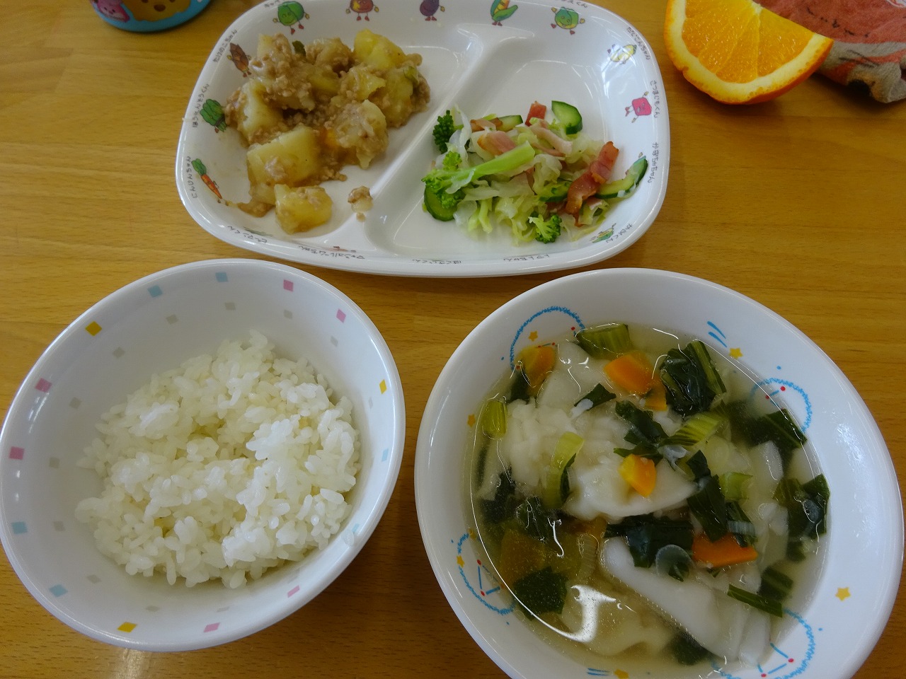 7月30日(木)給食 ・ごはん ・じゃがいものそぼろ煮(豚挽肉・じゃがいも・玉ねぎ・にんじん・いんげん) ・ベーコンカリカリサラダ(ベーコン・キャベツ・ブロッコリー・きゅうり) ・ワンタンスープ(ワンタン・にんじん・ちんげん菜・ねぎ) ・オレンジ