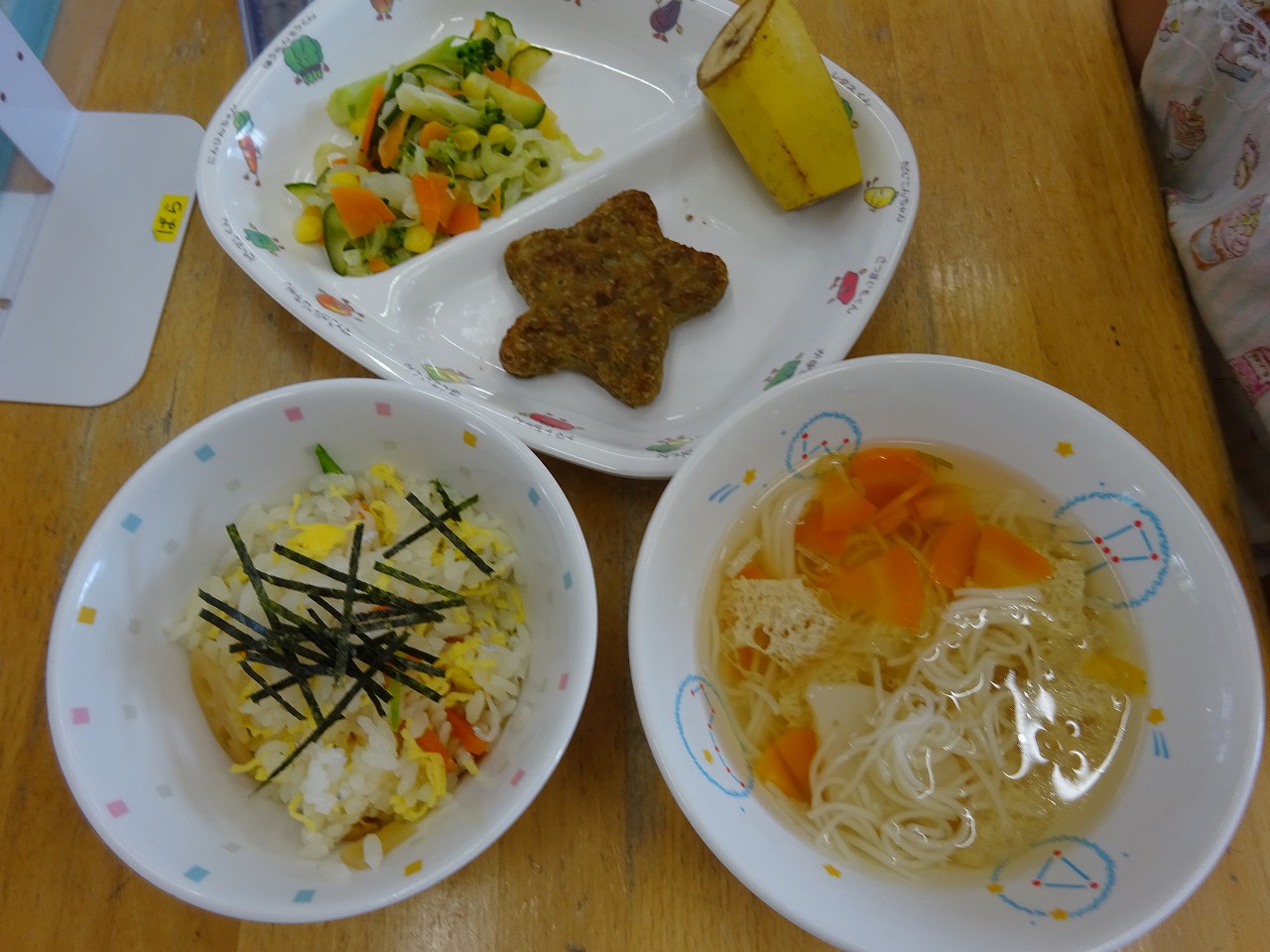 8月4日(火)給食 ・ちらし寿司(米・しらす干し・卵・にんじん・えんどう) ・星ハンバーグ ・コーンサラダ(コーン・ブロッコリー・キャベツ・きゅうり・にんじん) ・そうめん汁(そうめん・かまぼこ・油揚げ・にんじん・ねぎ) ・バナナ