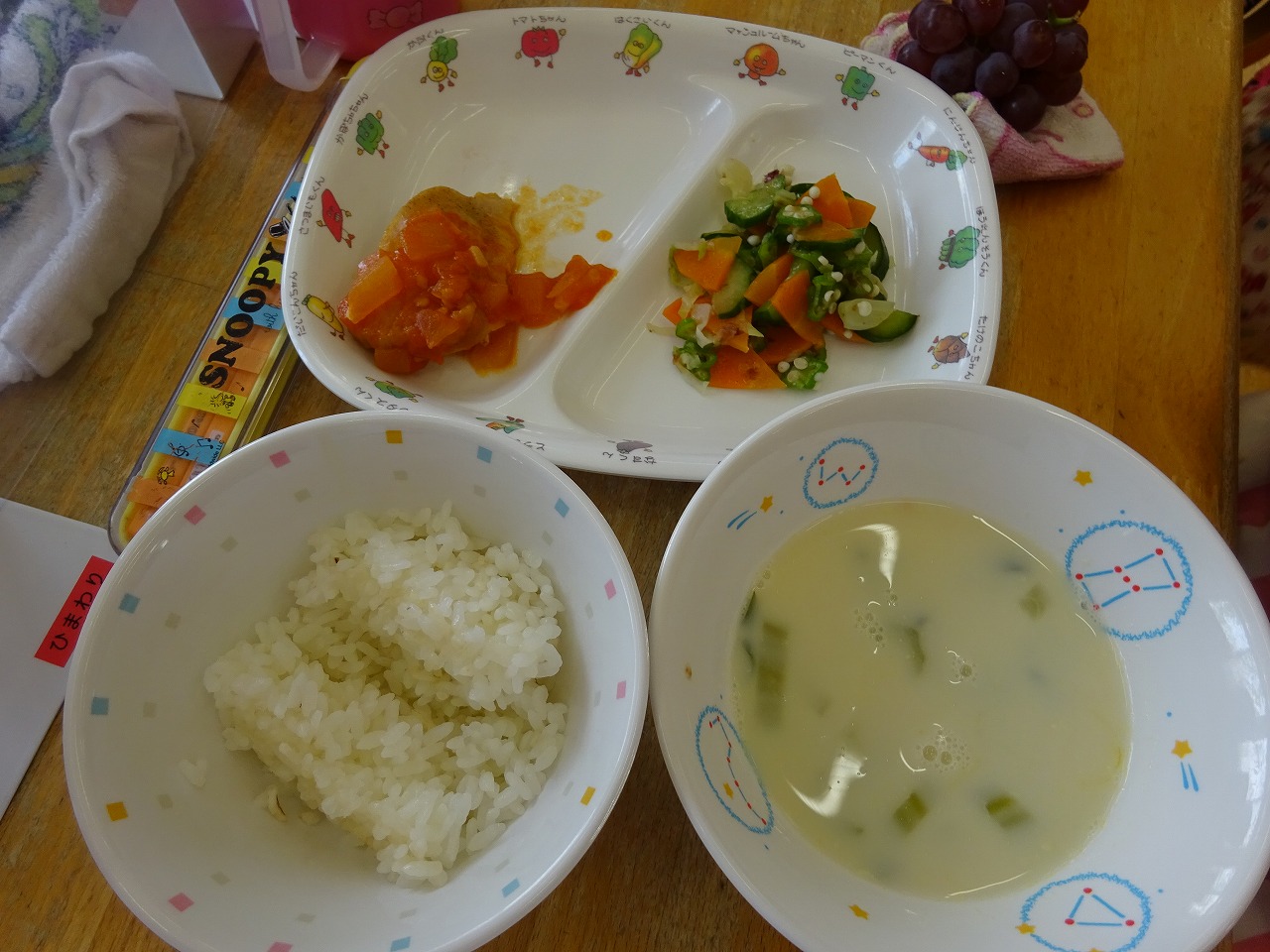 8月5日(水)給食 ・ごはん ・鶏肉のトマトソース(鶏肉・玉ねぎ・トマト) ・オクラの和え物(オクラ・キャベツ・にんじん・きゅうり・かつお節) ・豆乳スープ(じゃがいも・玉ねぎ・ちんげん菜・にんじん・豆乳) ・ぶどう