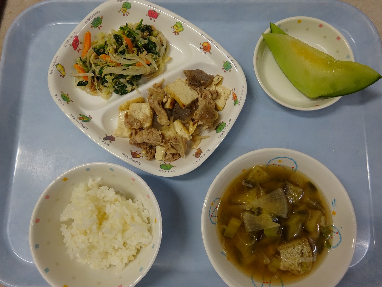 8月6日(木)給食 ・ごはん ・肉豆腐(豚肉・焼き豆腐・玉ねぎ・こんにゃく・えのきたけ) ・ほうれん草サラダ(ほうれん草・キャベツ・にんじん・もやし・ツナ・ごま) ・みそ汁(なす・油揚げ・だいこん・ねぎ・わかめ・みそ) ・メロン