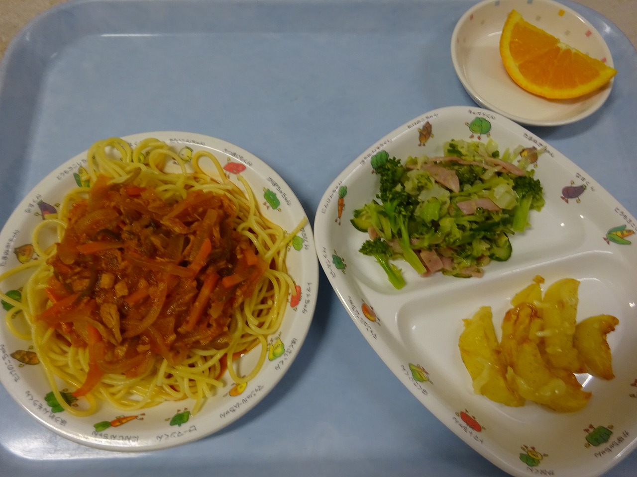 8月7日(金) 給食 ・ツナスパゲティ(麺・ツナ・玉ねぎ・にんじん・ピーマン・トマトピューレ) ・グリーンサラダ(キャベツ・きゅうり・ブロッコリー・ハム) ・じゃが芋のマヨ焼き(じゃがいも・マヨドレ・パセリ) ・ゼリー