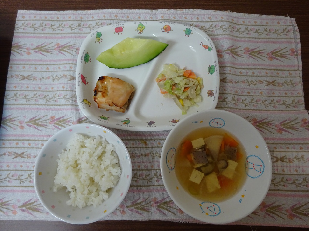 6月7日(金)給食:かみかみメニュー ・ごはん ・鶏肉の西京焼き ・かみかみサラダ ・たぬき汁 ・メロン