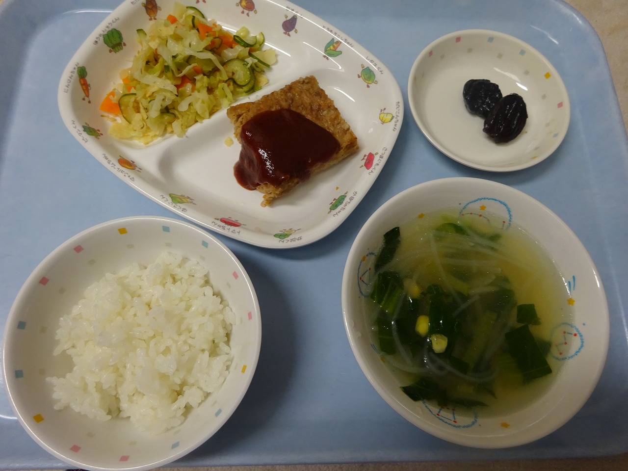 6月16日(火)給食 ・ごはん ・ミートローフ(合ひき肉・玉ねぎ・にんじん・卵・パン粉・牛乳・グリンピース) ・チップスサラダ(キャベツ・きゅうり・にんじん・ポテト) ・はるさめスープ(マロニー・チンゲン菜・玉ねぎ・コーン) ・プルーン