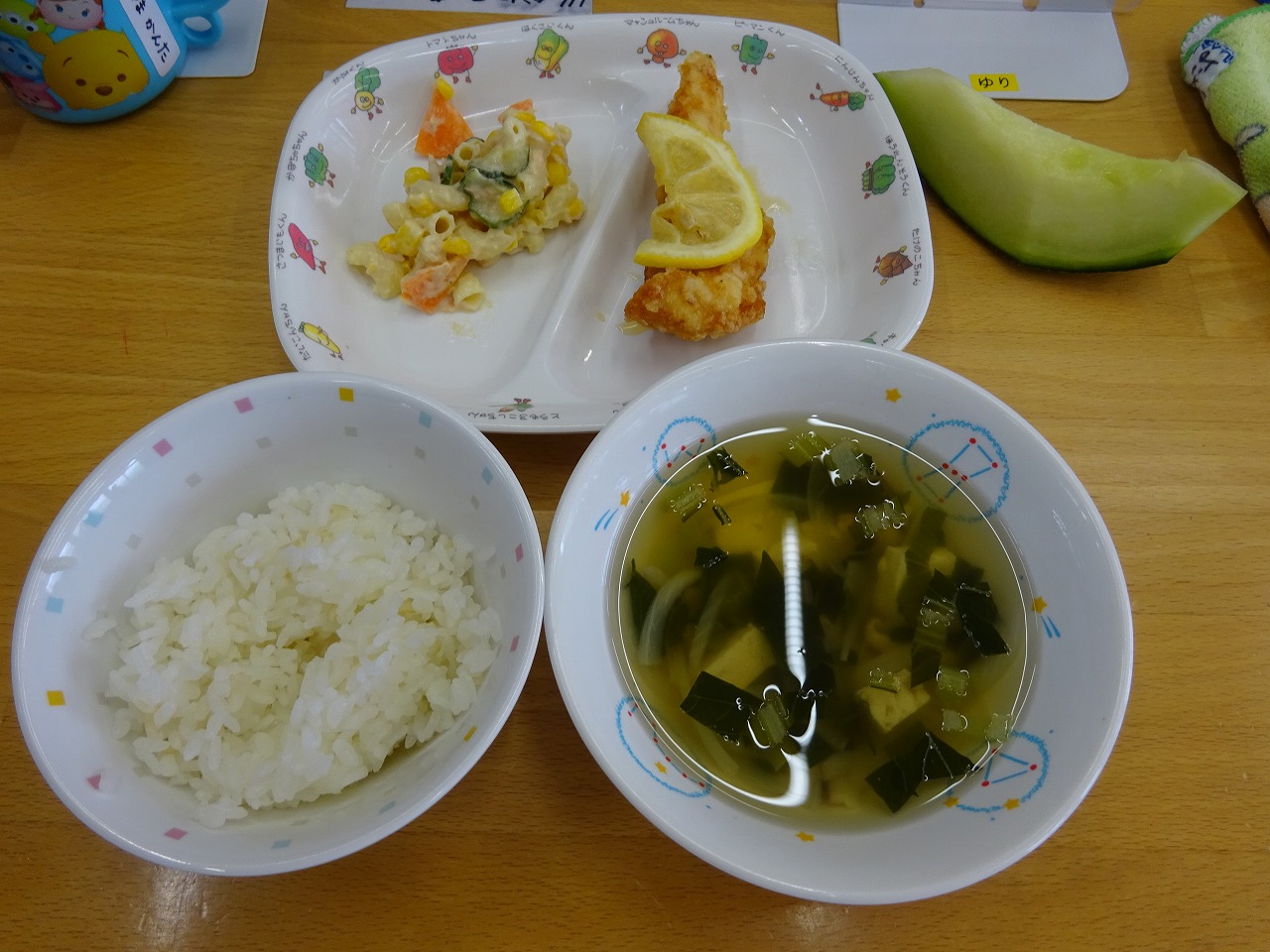 6月30日(火)給食 ・味ごはん(米・ツナ・にんじん・ごぼう) ・鶏肉のから揚げ ・ほうれん草とハムのサラダ(キャベツ・ほうれん草・にんじん・ハム・コーン・マヨドレ) ・すまし汁(豆腐・かまぼこ・にんじん・玉ねぎ・みつば) ・メロン
