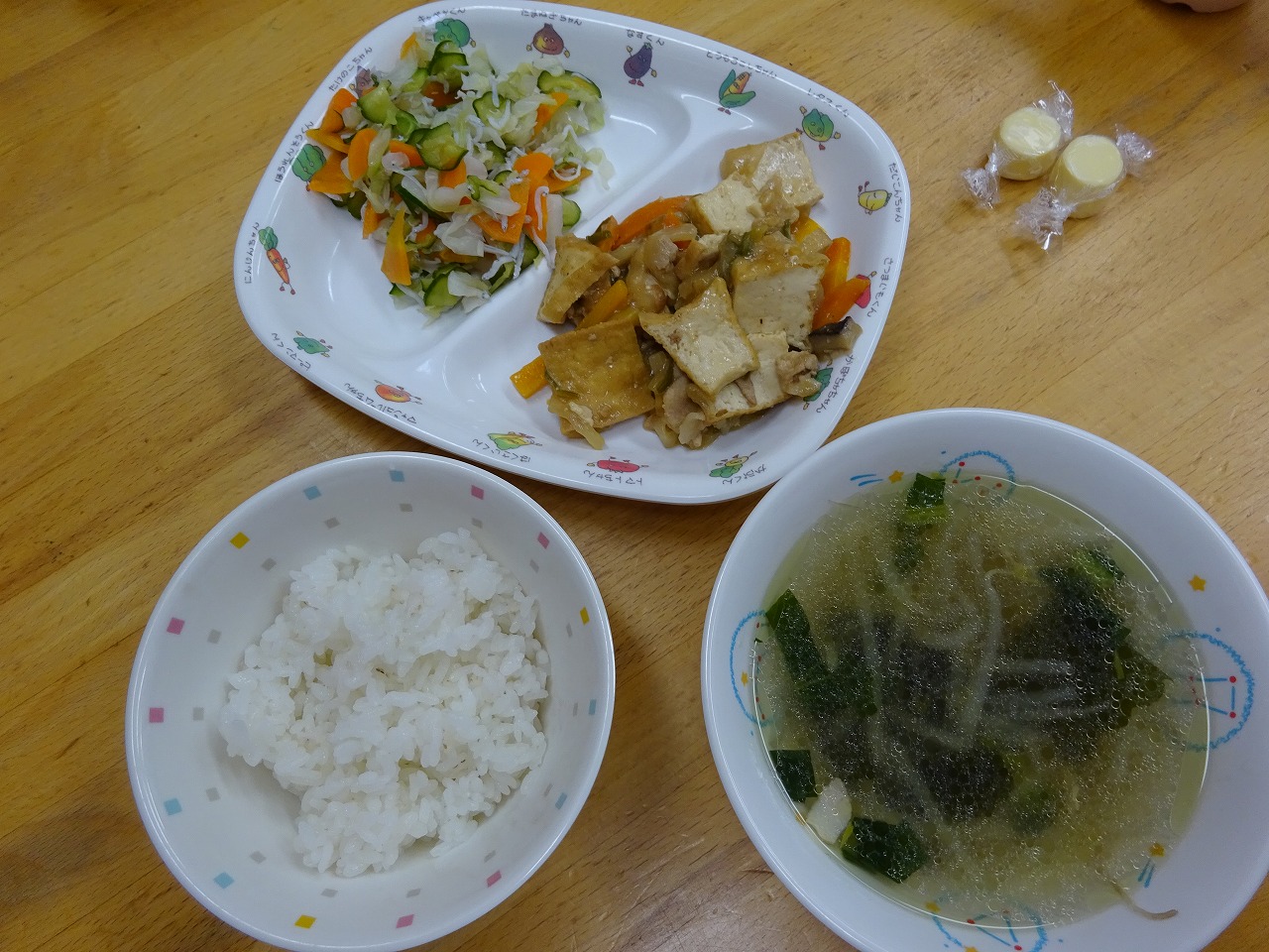 6月26日(金)給食 ・ごはん ・厚揚げのみそ炒め(厚揚げ・豚肉・玉ねぎ・にんじん・ピーマン・みそ) ・キャベツの甘酢あえ(キャベツ・きゅうり・にんじん・しらす干し) ・やさいスープ(こまつな・ベーコン・もやし・わかめ・ねぎ) ・チーズ