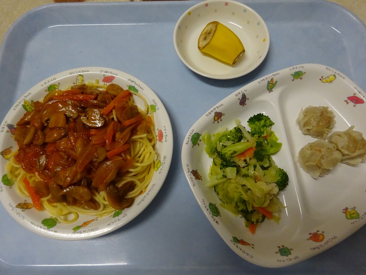 6月2日(火) 給食 ・ナポリタンスパゲティ(麺・ウインナー・玉ねぎ・にんじん・ピーマン) ・ブロッコリー中華あえ(ブロッコリー・キャベツ・きゅうり・にんんじん) ・蒸しシューマイ ・バナナ