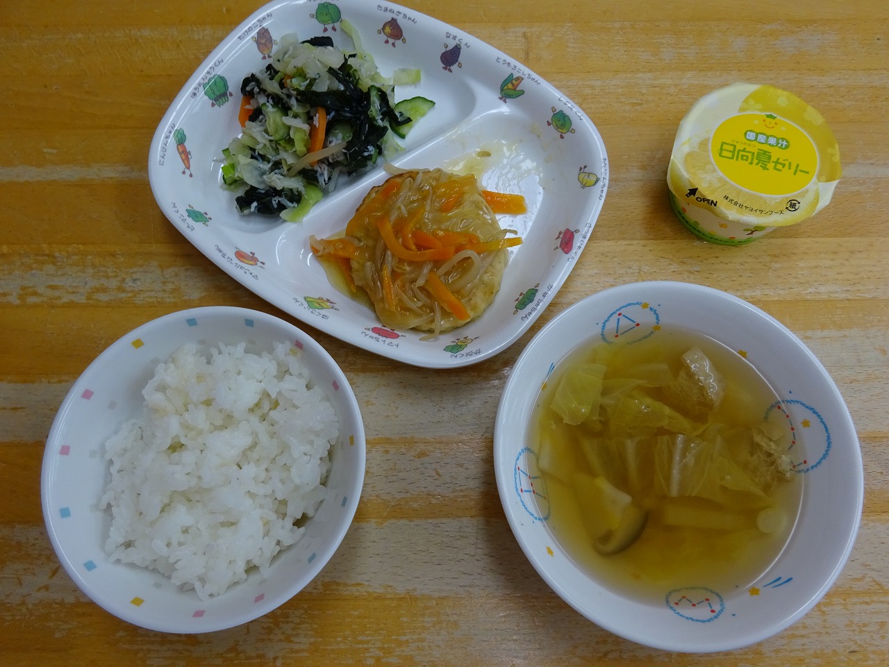 6月5日(金)給食 ・ごはん ・豆腐バーグ野菜あんかけ(豆腐ハンバーグ・玉ねぎ・にんじん・もやし) ・きゅうりの酢の物(きゅうり・キャベツ・にんじん・しらす干し・わかめ) ・白菜スープ(白菜・かまぼこ・しいたけ・油揚げ・ねぎ) ・日向夏ゼリー
