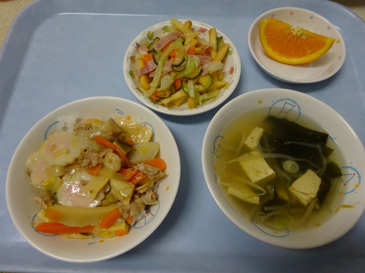 6月15日(月)給食 ・中華どんぶり(米・豚肉・えび・白菜・にんじん・たけのこ・玉ねぎ・なると・干ししいたけ) ・しょうゆフレンチ(キャベツ・きゅうり・にんじん・ハム・フライドポテト) ・わかめスープ(わかめ・豆腐・もやし・ねぎ) ・オレンジ 《おやつ》 牛乳 ・ 手作りお好み焼き