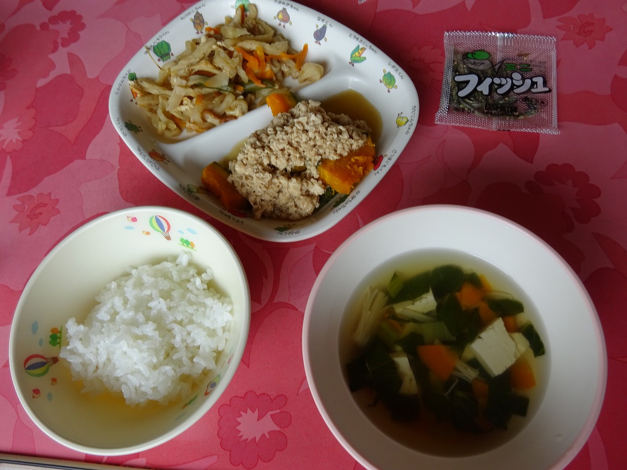 6月12日(金)給食 ・ごはん ・かぼちゃのそぼろあんかけ(かぼちゃ・鶏ひき肉) ・切干大根の煮物(切干大根・油揚げ・にんじん・ちくわ・いんげん) ・すまし汁(豆腐・こまつな・玉ねぎ・にんじん・えのきたけ) ・ミニフィッシュ