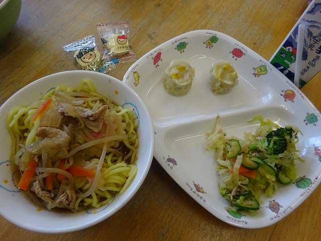 3月23日(月)給食 ・しょうゆラーメン(麺・豚肉・なると・玉ねぎ・もやし・にんじん・ねぎ) ・ブロッコリーおかかあえ(ブロッコリー・キャベツ・きゅうり・にんじん・かつお節) ・コーンシューマイ ・チーズ
