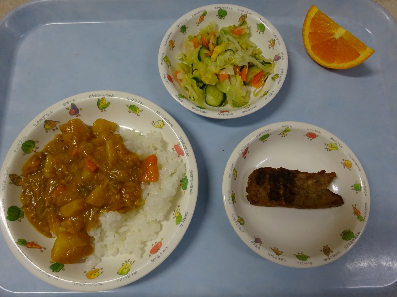 6月1日(月) 給食 ・カレーライス(米・ツナ・じゃがいも・玉ねぎ・にんじん・ピーマン) ・ハンバーグ ・フレンチサラダ(キャベツ・きゅうり・にんじん・コーン) ・オレンジ
