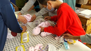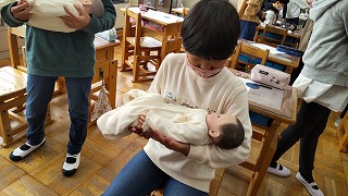 授業の始めに、最初の自分ができた時の大きさを確認し、助産師さんから自分が生まれてきた事は奇跡である事やお腹の中で育っていく様子などを教えてもらい、育児中のお母さんからは、出産の事や子育ての話を聞き自分も家族に育ててもらっての今だということを感じる時間です。胎児人形や赤ちゃん人形を抱っこしてもらい、大きさや重さを感じ「こんなに小さかったけど大きくなったね。」と成長を喜び、自分も友達も大切な存在だという事を確認する機会になっています。