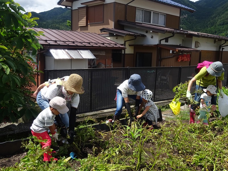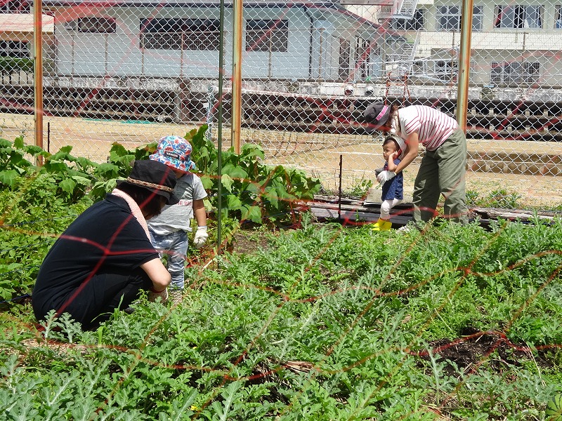 臨時農園Dayを行いました。親子で畑の草取りや育てている作物に水やりをしました。前回来た時よりも大きく生長している作物に驚いていました。試しにじゃがいもを一株収穫してみました。19日には全てのじゃがいもを収穫します。