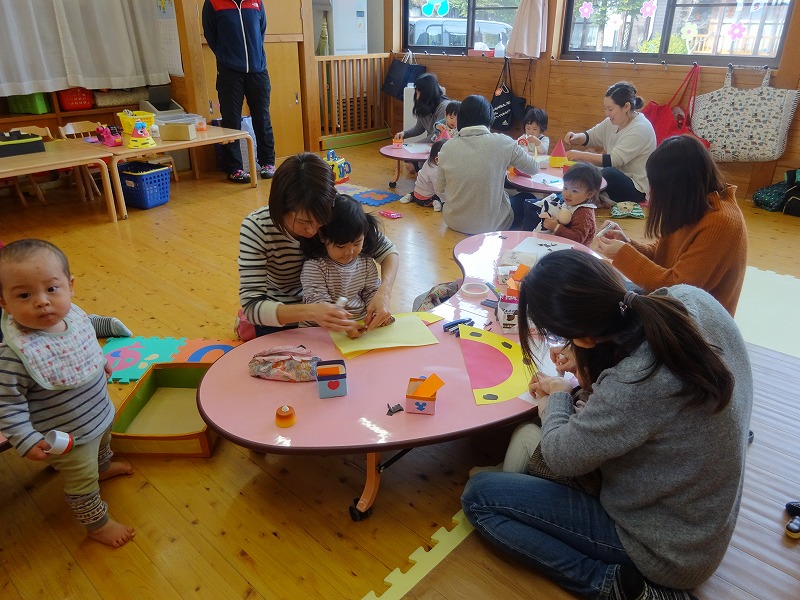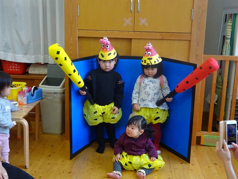 2日間に分けて行った「三角帽子の鬼作り」に21組47人の参加がありました。子どもたちはシールを貼ったり、手でちぎったり、糊付けしたり、たくさんお手伝いをしてくれて、とても素敵な鬼の帽子が出来上がりました。金棒を持ち、鬼のパンツを履いて鬼の帽子を被り、可愛い子鬼が勢揃い!とっても可愛らしかったです。