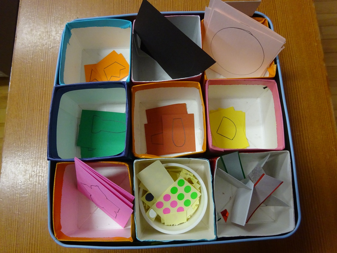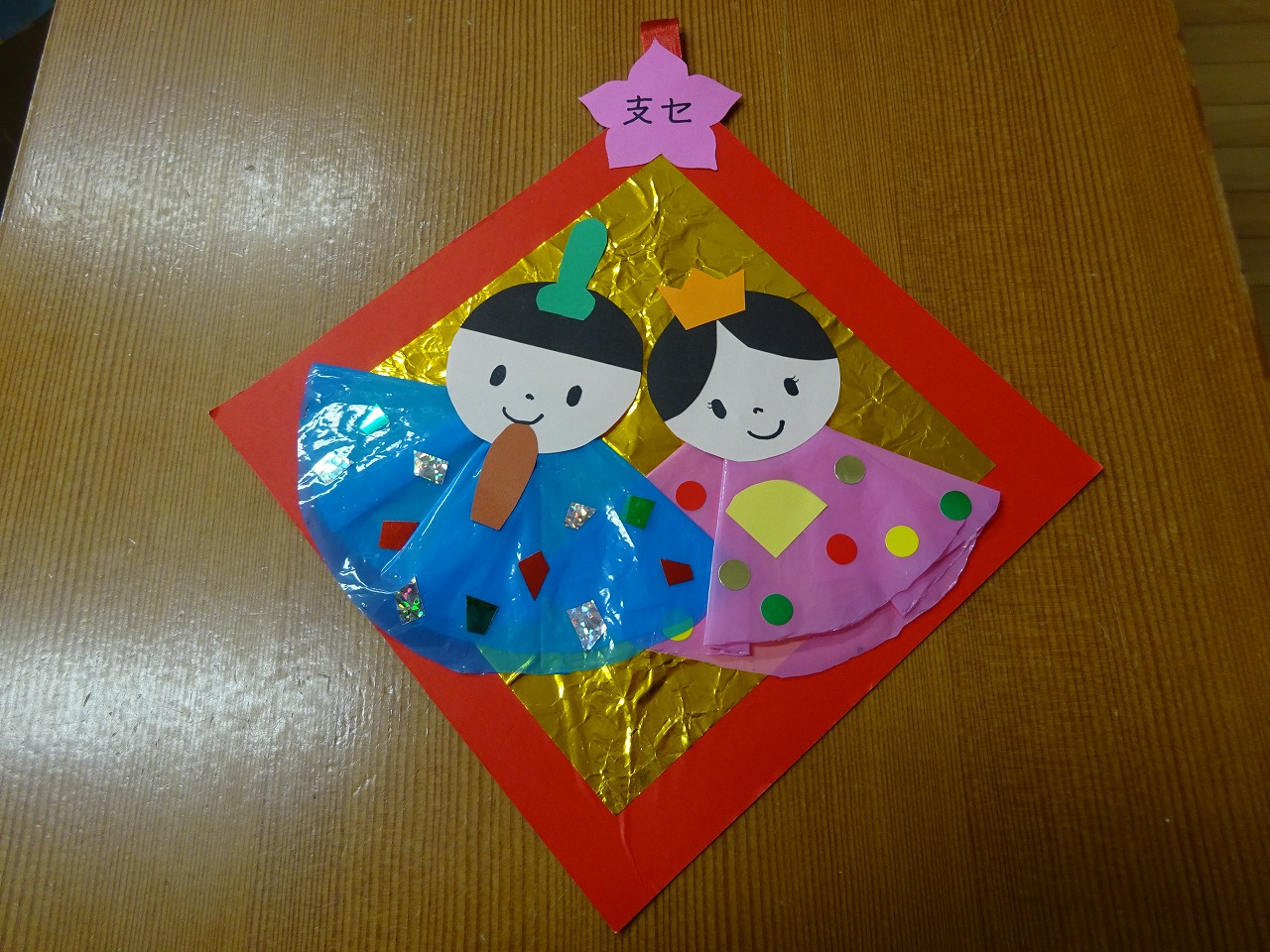 3月は桃の節句。土台の厚紙に、カラーポリ袋の柔らかい着物を着せた『飾りびな』の製作キットを用意しました。おだいり様、おひな様のパーツは切って貼れるように、下絵を描いて簡単に作れるようにしました。顔はお子さんの手が加わるように、自由に描いてもらうようにしました。中には、お子さんの顔写真を貼って楽しまれた方もみえました。