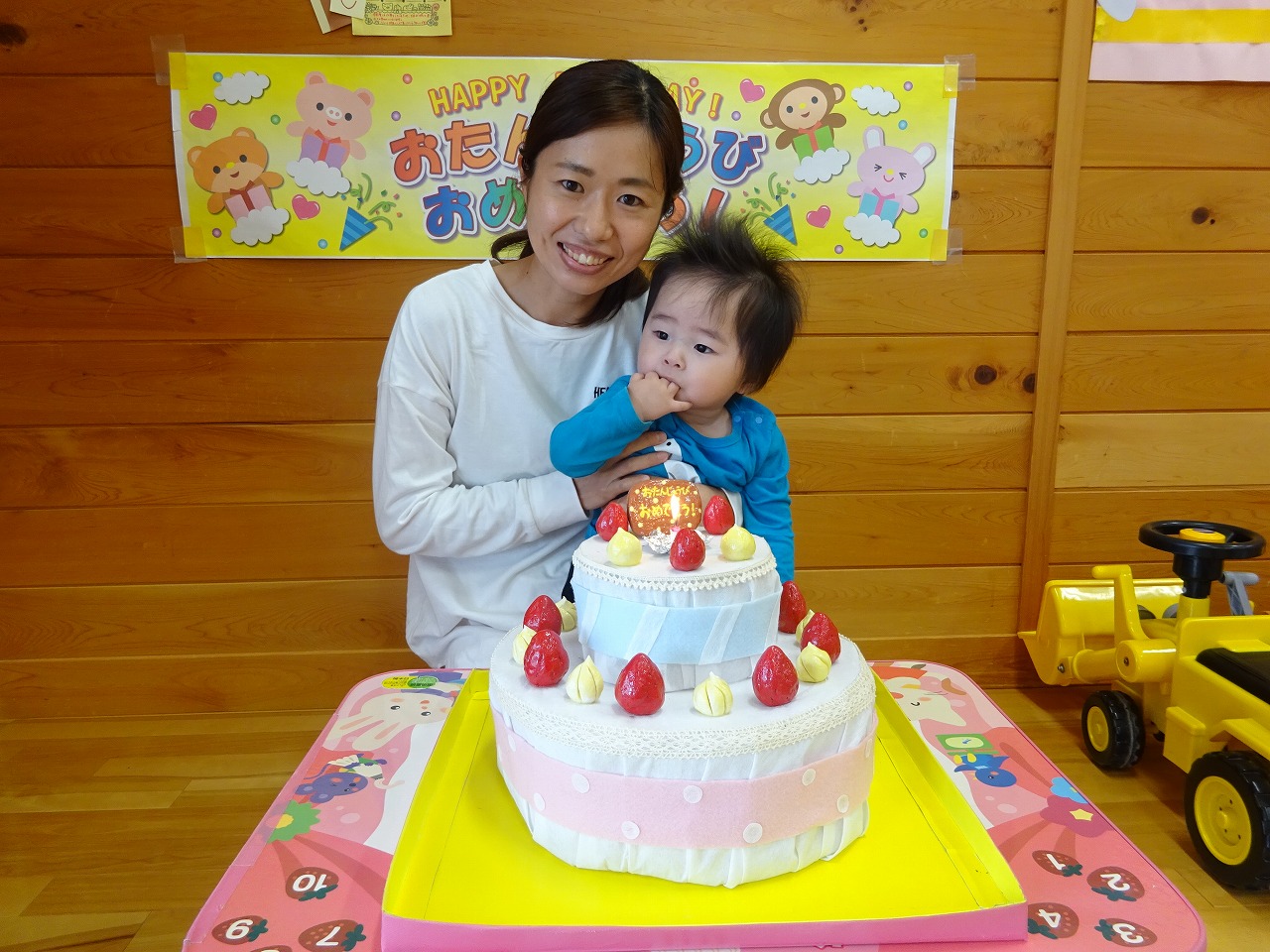 今年度も個別で誕生会を行っています。 かわいいバースデイカードに手形を押し、ろうそくのついたケーキと一緒に親子で記念撮影。身長と体重も測り、改めて「おおきくなったな〜」と成長の喜びを感じられるひとときとなりました。