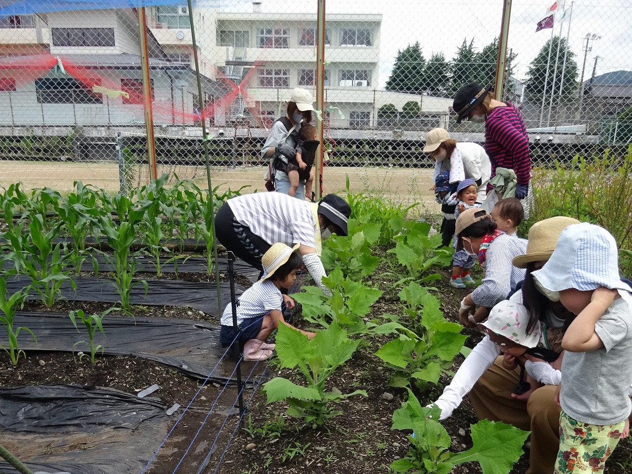 蒸し暑い中でしたが、10組の親子が参加してくださいました。前日に雨がたくさん降ったので、水やりはなしとし、草取りをしていただきました。先週より更に大きくなったとうもろこしに皆さんびっくり。 背比べをして写真を撮り、楽しいひとときとなりました。