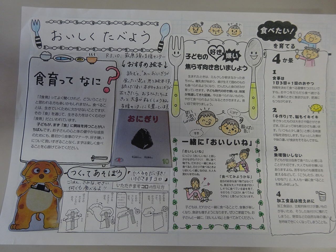 子どもたちに大人気のシリーズ絵本のキャラクターのコロちゃんがおにぎりやニンジン、魚をパクパク食べる人形と資料、レシピを通じて、親子で楽しく食に興味をもってもらえたようです。 資料、レシピははいつでも配布しています。