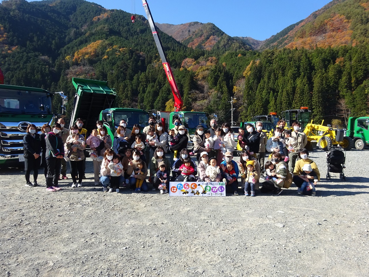 こりすくらぶの企画「馬瀬建設で重機を見よう」がおこなわれました。 馬瀬建設の皆さんがたくさんの重機とシールラリーを準備して下さり、見るだけでなく実際にダンプトラックやショベルカーに乗ったり、ゴミ収集車にゴミを入れてボタンを押したりと、親さんも初体験の方が多く親子で大興奮のひとときとなりました。 たっぷり遊んだあとはおみやげもいただけて、紅葉がきれいな大自然の中でよい時間が過ごせました。