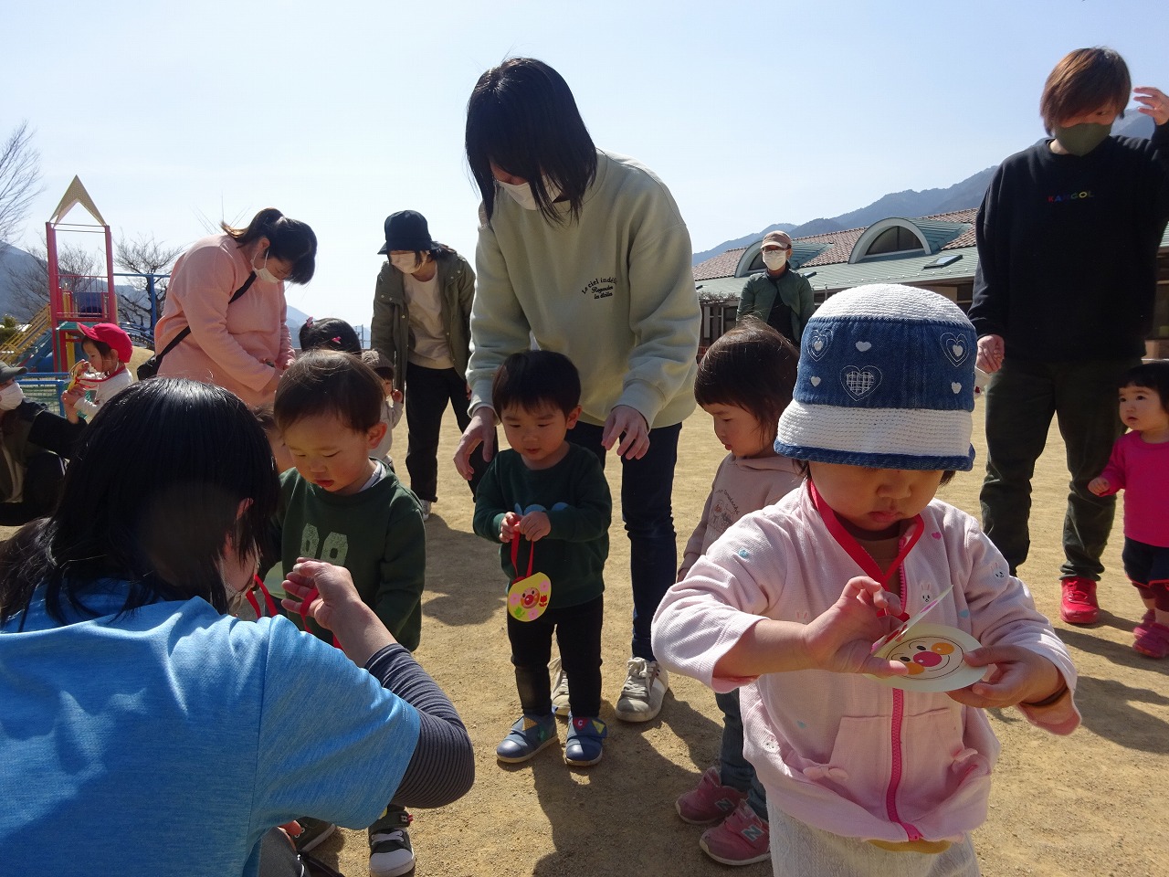 3月11日(金)ポカポカ陽気の中、人数制限をして園庭開放をおこないました。 1年で大きくなったお子さんの成長を感じながら、お母さんたちも一緒にたくさん体を動かして遊んでみえました。 4月から年少さんになるお子さんが多かったので、お片付けの後は「からだダンダン」の体操をし、最後にメダルをプレゼントしました。 入園に期待をもってもらえると嬉しいです。