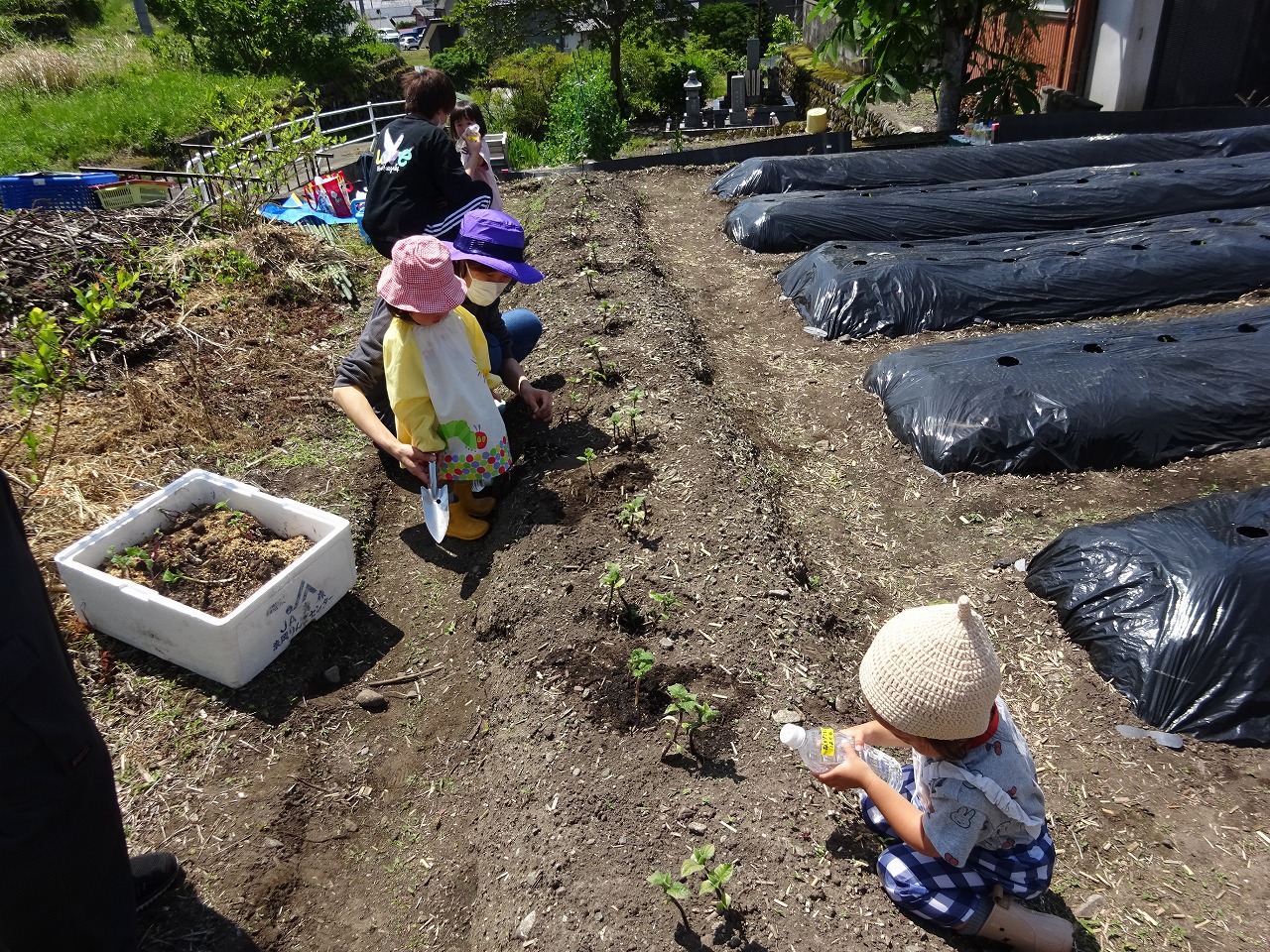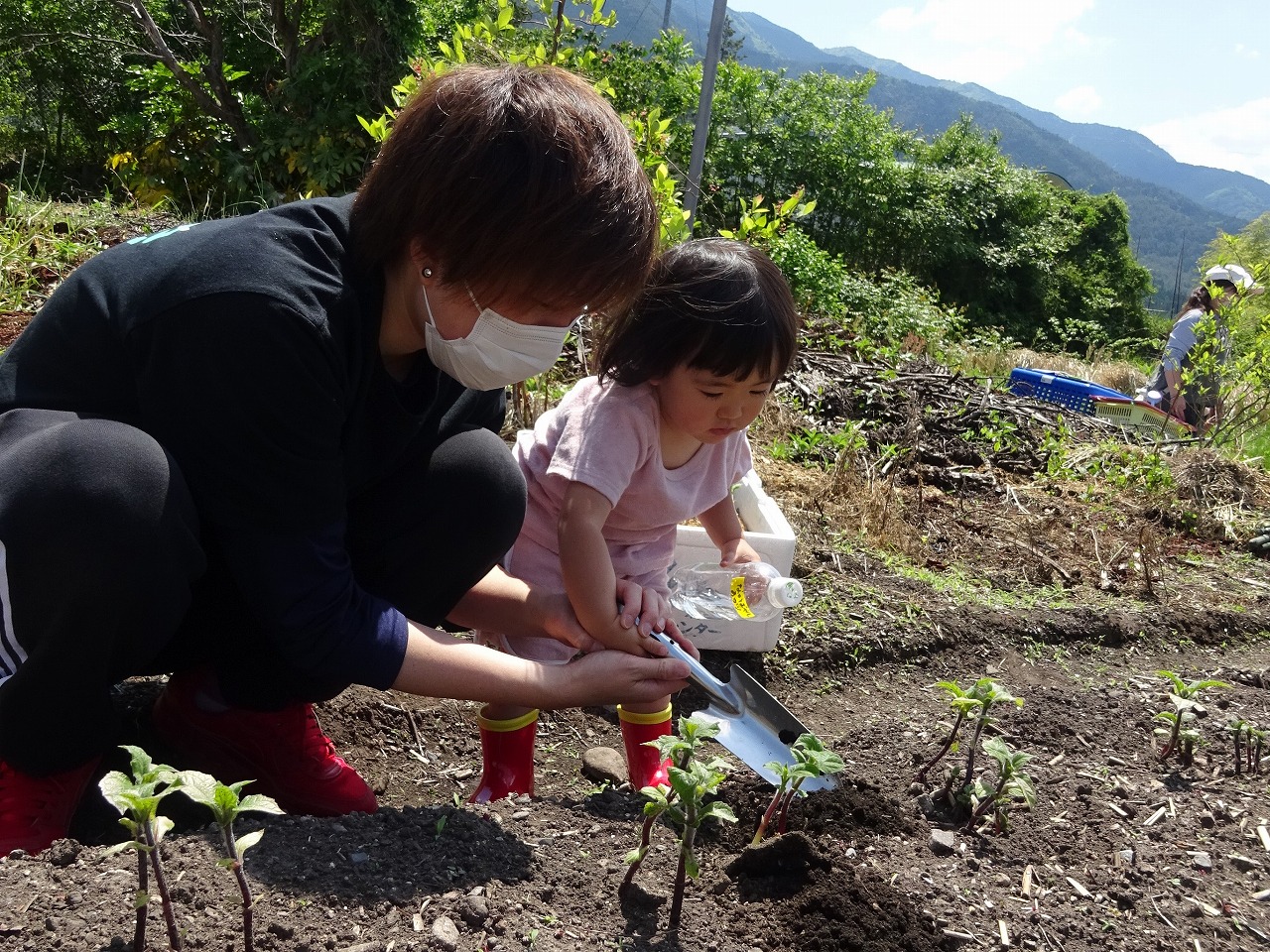 5月24日(火)農園デーをおこない、7組14名が参加しました。 先週植えたヤーコンの土がカラカラだったので水やりをしていただくと、少し経ってシャキッとしてきたので参加して下さる皆さんの力を感じました。 とうもろこしは小さな芽が顔をのぞかせていたので、お母さん方は「もう芽が出てる!」と一週間の生長を喜んでみえました。 お子さんたちの反応も年齢によって様々ですが、お家の方との活動はとっても楽しそうでした。