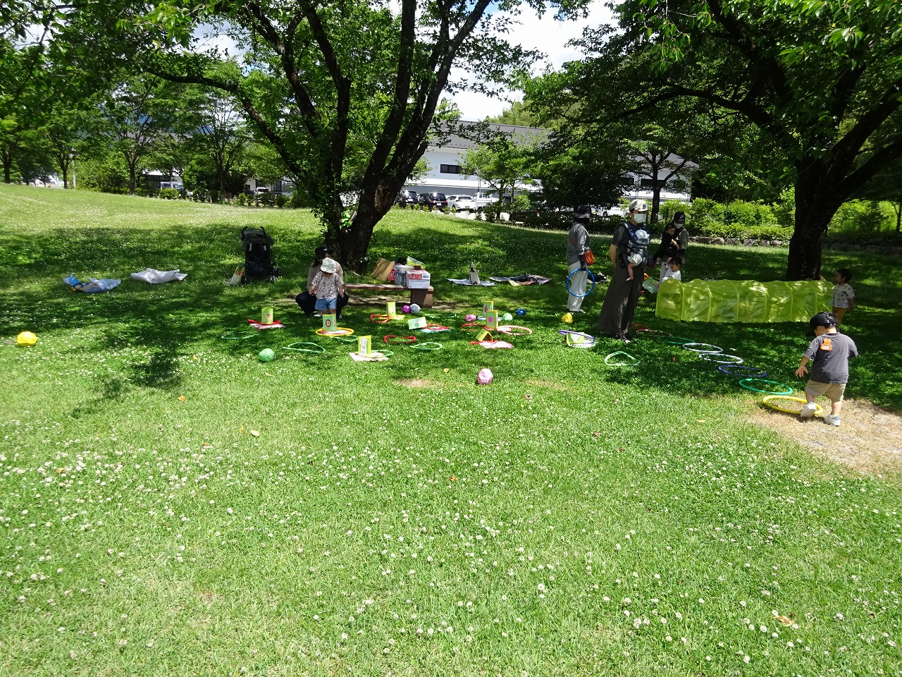 6月9日(木)、飛騨川公園でこりすくらぶがおこなわれ、来年度年少さんになるAグループの親子が参加されました。 みんなでバスごっこや体操をしたあと、トンネルやフープ、ボールや輪投げを使い、体をたくさん動かして遊びました。 木陰がたくさんの広い野原でお母さんや友だちと一緒に遊ぶことができてとても楽しそうでした。