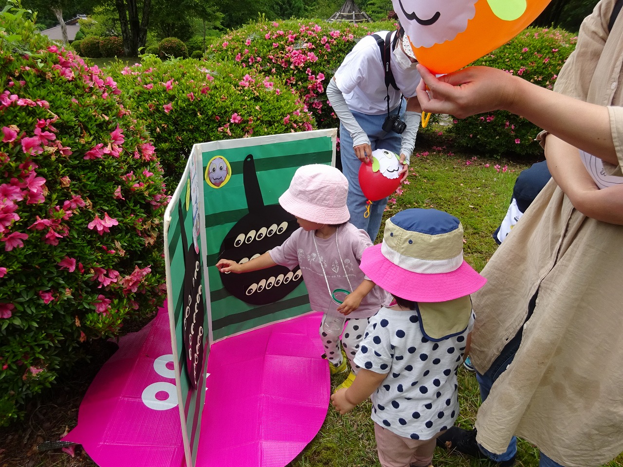 最初に支援センターで用意したポストに、アンパンマンカードを入れると鯉のエサが出てくる自動販売機!?があり、どんな仕掛けになっているかとびっくりしていたお母さんとお子さんたちでした。
