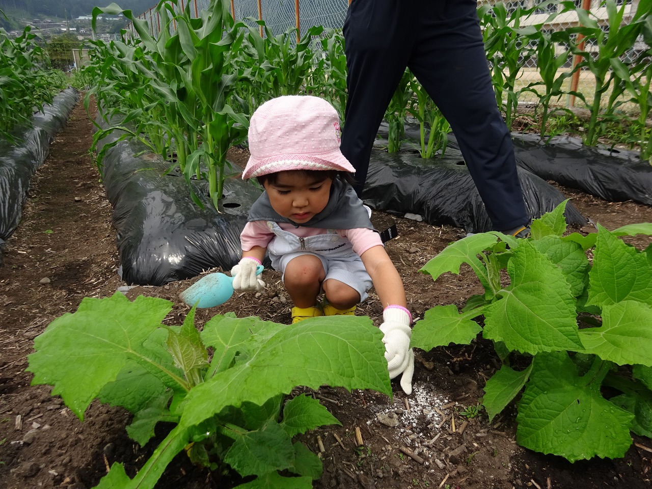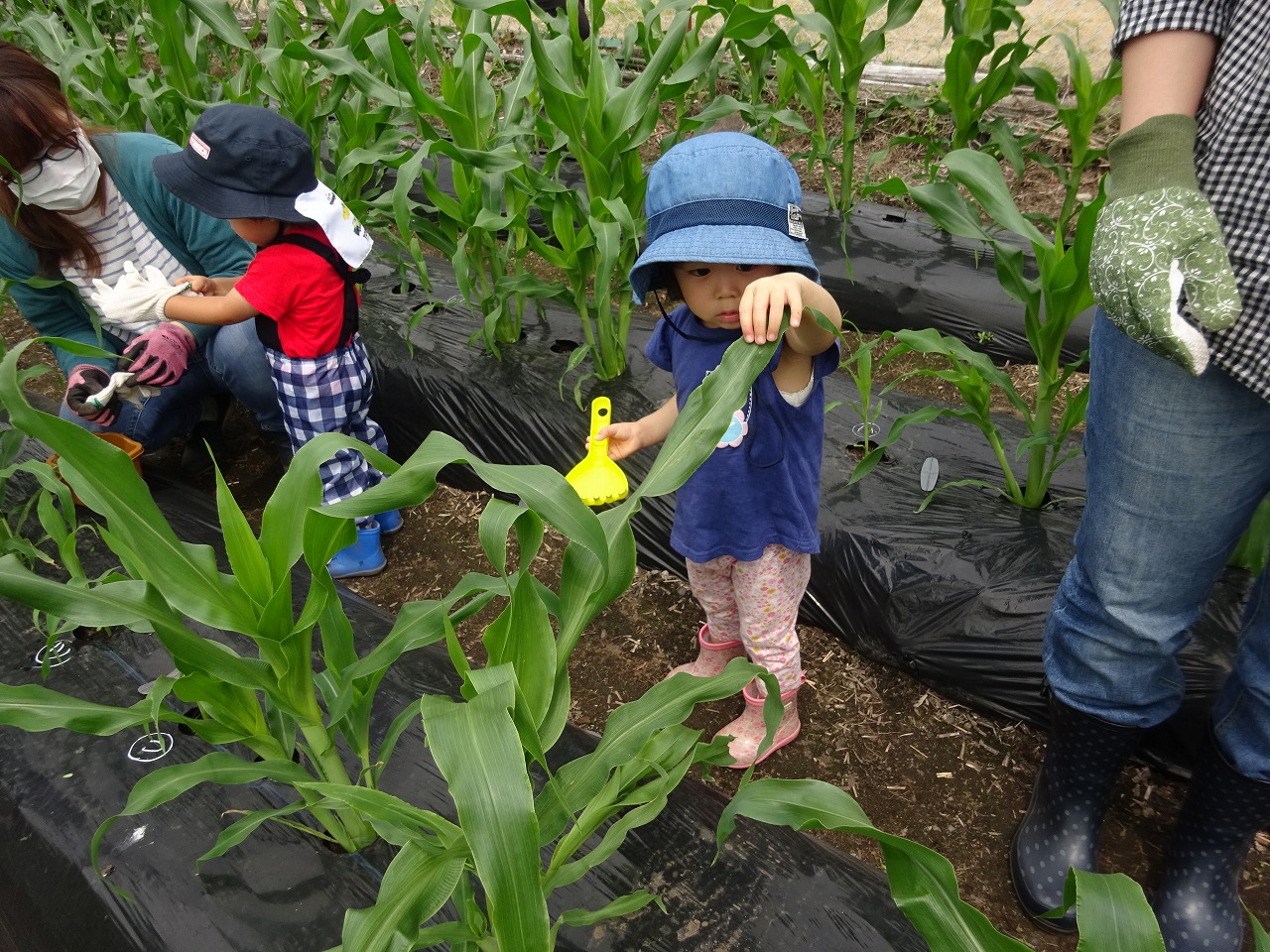 天気都合で2週間活動が出来なかったので、大きくなったとうもろこしやヤーコンを見てびっくりしていた皆さんでした。「あの小さな種があっという間に子どもの背丈ほどになるんですね」と言って見えた方が多く、とうもろこしの生長とお子さんの成長を重ね合わせて感じてみえたようでした。