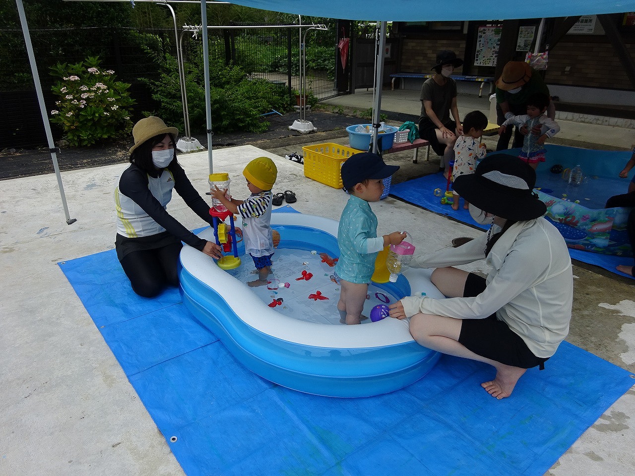 7月25日(月)馬瀬子育て支援センターと北児童館とのコラボ企画でおひさまひろば「馬瀬のプールで遊ぼう」をおこない、7組の親子が参加されました。