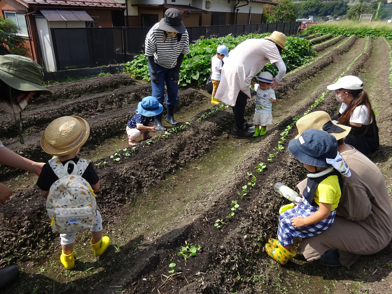 9月13日(火)おひさま農園デーをおこない、10組の親子の参加がありました。 先週蒔いた大根と人参の芽が出てきており、小さな芽に優しく水をあげてくれたお子さんたちでした。 大きく立派になったヤーコンにも驚き、葉っぱに触ったり、草を取ったりと親子で楽しく活動することができました。
