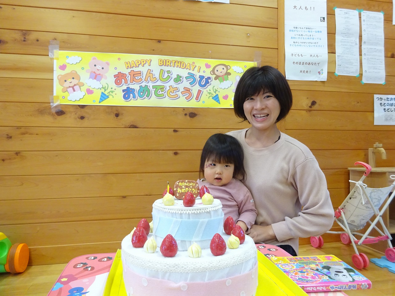 今月も個別で誕生会をしました。3歳になったお子さんには「大きくなったら…?」とインタビューしてみるととても嬉しそうに答えてくれました。お祝いをして下さった利用者さんがたくさんいたので、みんなでそれぞれのお子さんの成長を感じることができました。