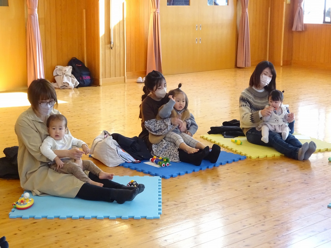 12月8日(木)みなみこども園遊戯室でミニ講座「のぶこ先生の話」をおこない、10組20人の親子が参加しました。 「子どもの見かた、大人の関わり方」と題して、子育て中のお母さん方が日頃の我が子との関わりをを振り返りながら、気持ちがとっても楽になるお話をたくさんしていただきました。後半は体や心の発達を促すおうちでもできる親子ふれあい遊びをおこないました。お子さんたちもお母さん方もとてもいい笑顔でたくさん体を動かすことができ、いいリフレッシュになった様子でした。
