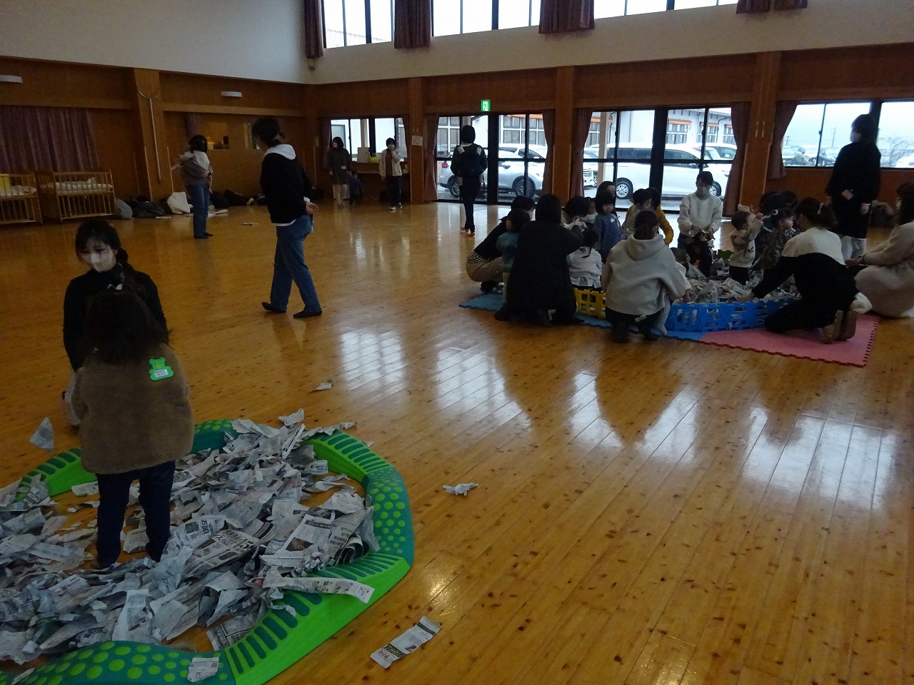 親子で新聞を引っ張り合いっこしてびりびりに破いたり、雪のように思い切りまき散らしてひらひらを楽しんだりと手先や体をたくさん使って遊びことができました。たくさんびりびりした後は、ブロックで作ったプールの中に新聞をたくさん入れて新聞プールにしました。プールの中の子ども達はとってもいい笑顔で家ではできない遊びに大満足の表情で、他にもボール作りや的当てなど自由にたくさん遊ぶ様子がありました。最後はみんなで袋の中に新聞を集めてアンパンマンの完成!親子共によい交流もできたようでした。